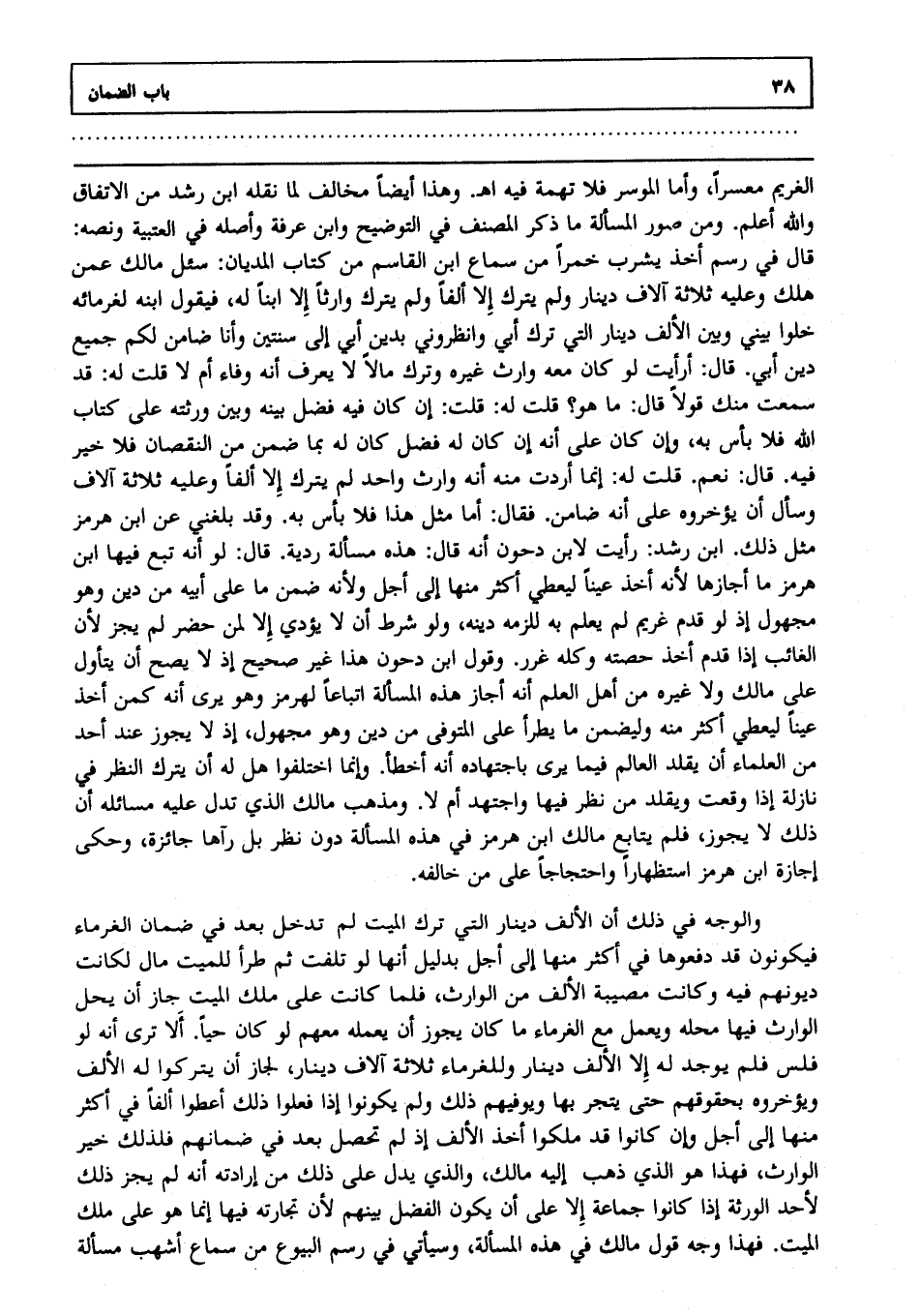 الغريم معسرا وأما الموسر فلا تهمة فيه ا هـ. وهذا أيضا مخالف لما نقله ابن رشد من الاتفاق والله أعلم. ومن صور المسألة ما ذكر المصنف في التوضيح وابن عرفة وأصله في العتبية ونصه قال في رسم أخذ يشرب خمرا من سماع ابن القاسم من كتاب المديان سئل مالك عمن هلك وعليه ثلاثة آلاف دينار ولم يترك إلا ألفا ولم يترك وارثا إلا ابنا له فيقول ابنه لغرمائه: خلوا بيني وبين الألف دينار التي ترك أبي وأنظروني بدين أبي إلى سنتين وأنا ضامن لكم جميع دين أبي قال: أرأيت لو كان معه وارث غيره وترك مالا لا يعرف أنه وفاء أم لا قلت: له قد سمعت منك قولا قال: ما هو قلت له قلت: إن كان فيه فضل بينه وبين ورثته على كتاب الله فلا بأس به، وإن كان على أنه إن كان له فضل كان له بما ضمن من النقصان فلا خير فيه قال: نعم قلت له: إنما أردت منه أنه وارث واحد ولم يترك إلا ألفا وعليه ثلاثة آلاف. وسئل أن يؤخروه على أنه ضامن فقال: أما مثل هذا فلا بأس به، وقد بلغني عن ابن هرمز مثل ذلك ابن رشد رأيت لابن دحون أنه قال هذه مسألة ردية قال لو أنه تبع فيها ابن هرمز ما أجازها؛ لأنه أخذ عينا ليعطي أكثر منها إلى أجل ولأنه ضمن ما على أبيه من دين وهو مجهول إذ لو قدم غريم لم يعلم به للزمه دينه ولو شرط أن لا يؤدي إلا لمن حضر لم يجز؛ لأن الغائب إذا قدم أخذ حصته وكله غرر وقول ابن دحون هذا غير صحيح إذ لا يصح أن يتأول على مالك ولا غيره من أهل العلم أنه أجاز هذه المسألة اتباعا لهرمز وهو يرى أنه كمن أخذ عينا ليعطي أكثر منه وليضمن ما يطرأ على المتوفى من دين وهو مجهول إذ لا يجوز عند أحد من العلماء أن يقلد العالم فيما يرى باجتهاده أنه أخطأ، وإنما اختلفوا هل له أن يترك النظر في نازلة إذا وقعت ويقلد من نظر فيها واجتهد أم لا؟ ومذهب مالك الذي تدل عليه مسائله أن ذلك لا يجوز فلم يتابع مالك ابن هرمز في هذه المسألة دون نظر بل رآها جائزة وحكى إجازة ابن هرمز استظهارا، واحتجاجا على من خالفه.
