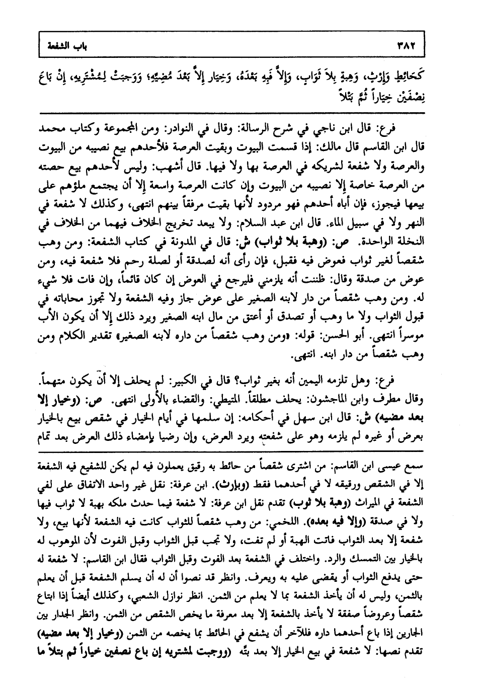 فرع: قال ابن ناجي في شرح الرسالة، وقال في النوادر: ومن المجموعة وكتاب محمد، قال ابن القاسم، قال مالك: إذا قسمت البيوت وبقيت العرصة فلأحدهم بيع نصيبه من البيوت والعرصة ولا شفعة لشريكه في العرصة بها ولا فيها، قال أشهب: وليس لأحدهم بيع حصته من العرصة خاصة إلا نصيبه من البيوت وإن كانت العرصة واسعة إلا أن يجتمع ملؤهم على بيعها فيجوز فإن أباه أحدهم فهو مردود؛ لأنها بقيت مرفقا بينهم، انتهى. وكذلك لا شفعة في النهر ولا في سبيل الماء، قال ابن عبد السلام: ولا يبعد تخريج الخلاف فيهما من الخلاف في النخلة الواحدة. ص: (وهبة بلا ثواب) ش: قال في المدونة في كتاب الشفعة: ومن وهب شقصا لغير ثواب فعوض فيه فقبل فإن رأى أنه لصدقة أو لصلة رحم فلا شفعة فيه ومن عوض من صدقة وقال: ظننت أنه يلزمني فليرجع في العوض إن كان قائما وإن فات فلا شيء له ومن وهب شقصا من دار لابنه الصغير على عوض جاز وفيه الشفعة ولا تجوز محاباته في قبول الثواب ولا ما وهب أو تصدق أو أعتق من مال ابنه الصغير ويرد ذلك إلا أن يكون الأب موسرا، انتهى. أبو الحسن قوله: "ومن وهب شقصا من داره لابنه الصغير" تقدير الكلام ومن وهب شقصا من دار ابنه. انتهى.