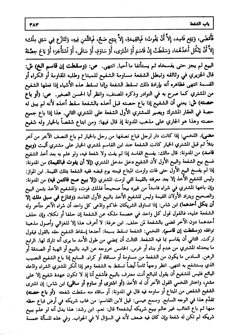 البيع لم يجز حتى يفسخاه ثم يستأنفا ما أحبا، انتهى. ص: (وسقطت إن قاسم إلخ) ش: قال الجزيري في وثائقه: وتبطل الشفعة مساومة الشفيع للمبتاع وطلبه المقاومة أو الكراء أو القسمة، انتهى. فظاهره أنه بإرادة ذلك تسقط الشفعة وإنما تسقط هذه الأشياء إذا فعلها الشفيع من المشتري كما صرح به في النوادر وذكره المصنف وانظر أبا الحسن الصغير. ص: (أو باع حصته) ش: يعني أن الشفيع إذا باع حصته قبل أخذه بالشفعة سقط أخذه، لأنه لم يبق له حصة في العقار المشترك ويصير للمشتري الأول الشفعة على المشتري الثاني هذا إذا باع جميع حصته وهذا هو الجاري على مذهب المدونة؛ إذ قال فيها: ومن ابتاع شقصا بالخيار وله شفيع
