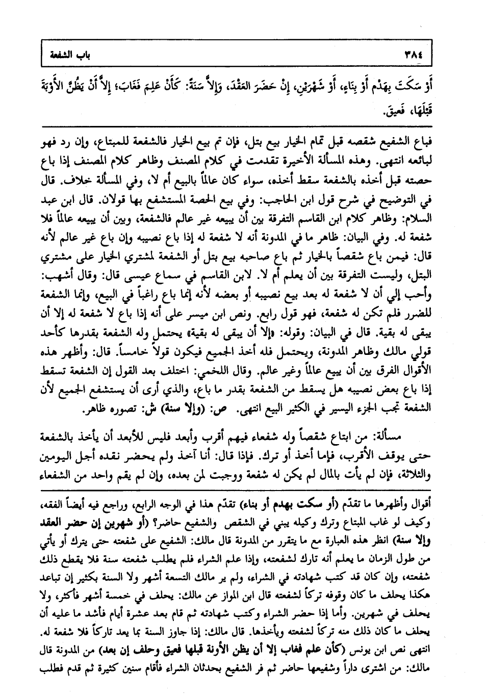 فباع الشفيع شقصه قبل تمام الخيار بيع بتل فإن تم بيع الخيار فالشفعة للمبتاع وإن رد فهو لبائعه، انتهى. وهذه المسألة الأخيرة تقدمت في كلام المصنف وظاهر كلام المصنف إذا باع حصته قبل أخذه بالشفعة سقط أخذه سواء كان عالما بالبيع أم لا وفي المسألة خلاف، قال في التوضيح في شرح قول ابن الحاجب وفي بيع الحصة المستشفع بها قولان، قال ابن عبد السلام: وظاهر كلام ابن القاسم التفرقة بين أن يبيعه غير عالم فالشفعة وبين أن يبيعه عالما فلا شفعة له وفي البيان: ظاهر ما في المدونة أنه لا شفعة له إذا باع نصيبه وإن باع غير عالم؛ لأنه قال فيمن باع شقصا بالخيار ثم باع صاحبه بيع بتل أن الشفعة لمشتري الخيار على مشتري البتل وليست التفرقة بين أن يعلم أم لا. لابن القاسم في سماع عيسى، قال: وقال أشهب: وأحب إلي أن لا شفعة له بعد بيع نصيبه أو بعضه؛ لأنه إنما باع راغبا في البيع وإنما الشفعة للضرر فلم تكن له شفعة فهو قول رابع ونص ابن ميسر على أنه إذا باع لا شفعة له إلا أن يبقى له بقية، قال في البيان: وقوله: "إلا أن يبقى له بقية" يحتمل وله الشفعة بقدرها كأحد قولي مالك وظاهر المدونة ويحتمل فله أخذ الجميع فيكون قولا خامسا، قال: وأظهر هذه الأقوال الفرق بين أن يبيع عالما وغير عالم، وقال اللخمي اختلف بعد القول أن الشفعة تسقط إذا باع بعض نصيبه هل يسقط من الشفعة بقدر ما باع؟ والذي أرى أن يستشفع الجميع؛ لأن الشفعة تجب بالجزء اليسير في الكثير البيع، انتهى. ص: (وإلا سنة) ش: تصوره ظاهر.