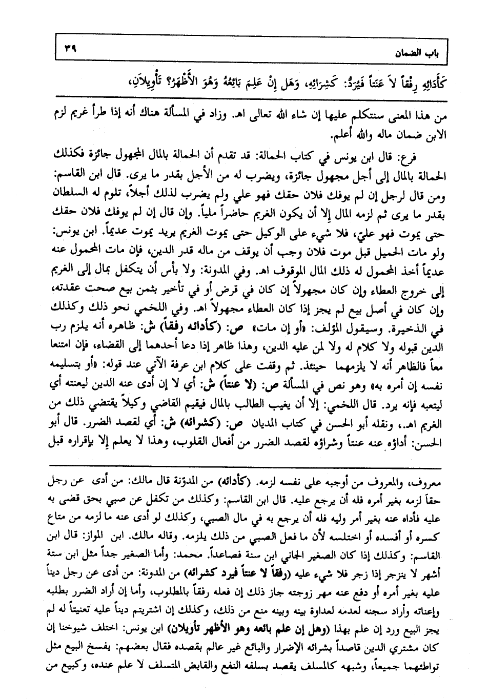 فرع: قال ابن يونس في كتاب الحمالة: قد تقدم أن الحمالة بالمال المجهول جائزة فكذلك الحمالة بالمال إلى أجل مجهول جائزة، ويضرب له من الأجل بقدر ما يرى قال ابن القاسم: ومن قال لرجل: إن لم يوفك فلان حقك فهو علي، ولم يضرب لذلك أجلا تلوم له السلطان بقدر ما يرى ثم لزمه المال إلا أن يكون الغريم حاضرا مليا، وإن قال إن لم يوفك فلان حقك حتى يموت فهو علي، فلا شيء على الوكيل حتى يموت الغريم يريد يموت عديما ابن يونس، ولو مات الحميل قبل موت فلان وجب أن يوقف من ماله قدر الدين فإن مات المحمول عنه عديما أخذ المحمول له ذلك المال الموقوف ا هـ. وفي المدونة ولا بأس أن يتكفل بمال إلى الغريم إلى خروج العطاء، وإن كان مجهولا إن كان في قرض، أو في تأخير بثمن بيع صحت عقدته، وإن كان في أصل بيع لم يجز إذا كان العطاء مجهولا ا هـ. وفي اللخمي نحو ذلك، وكذلك في الذخيرة وسيقول المؤلف: "أو إن مات". ص: (كأدائه رفقا) ش: ظاهره أنه يلزم رب الدين قبوله ولا كلام له ولا لمن عليه الدين، وهذا ظاهر إذا دعا أحدهما إلى القضاء فإن امتنعا معا فالظاهر أنه لا يلزمهما حينئذ ثم وقفت على كلام ابن عرفة الآتي عند قوله، أو بتسليمه نفسه إن أمره به وهو نص في المسألة. ص: (لا عنتا) ش: أي لا إن أدى عنه الدين ليعنته أي ليتعبه فإنه يرد قال اللخمي: إلا أن يغيب الطالب بالمال، فيقيم القاضي وكيلا يقتضي ذلك من الغريم ا هـ ونقله أبو الحسن في كتاب المديان. ص: (كشرائه) ش: أي لقصد الضرر قال أبو الحسن أداؤه عنه عنتا وشراؤه لقصد الضرر من أفعال القلوب، وهذا لا يعلم إلا بإقراره قبل