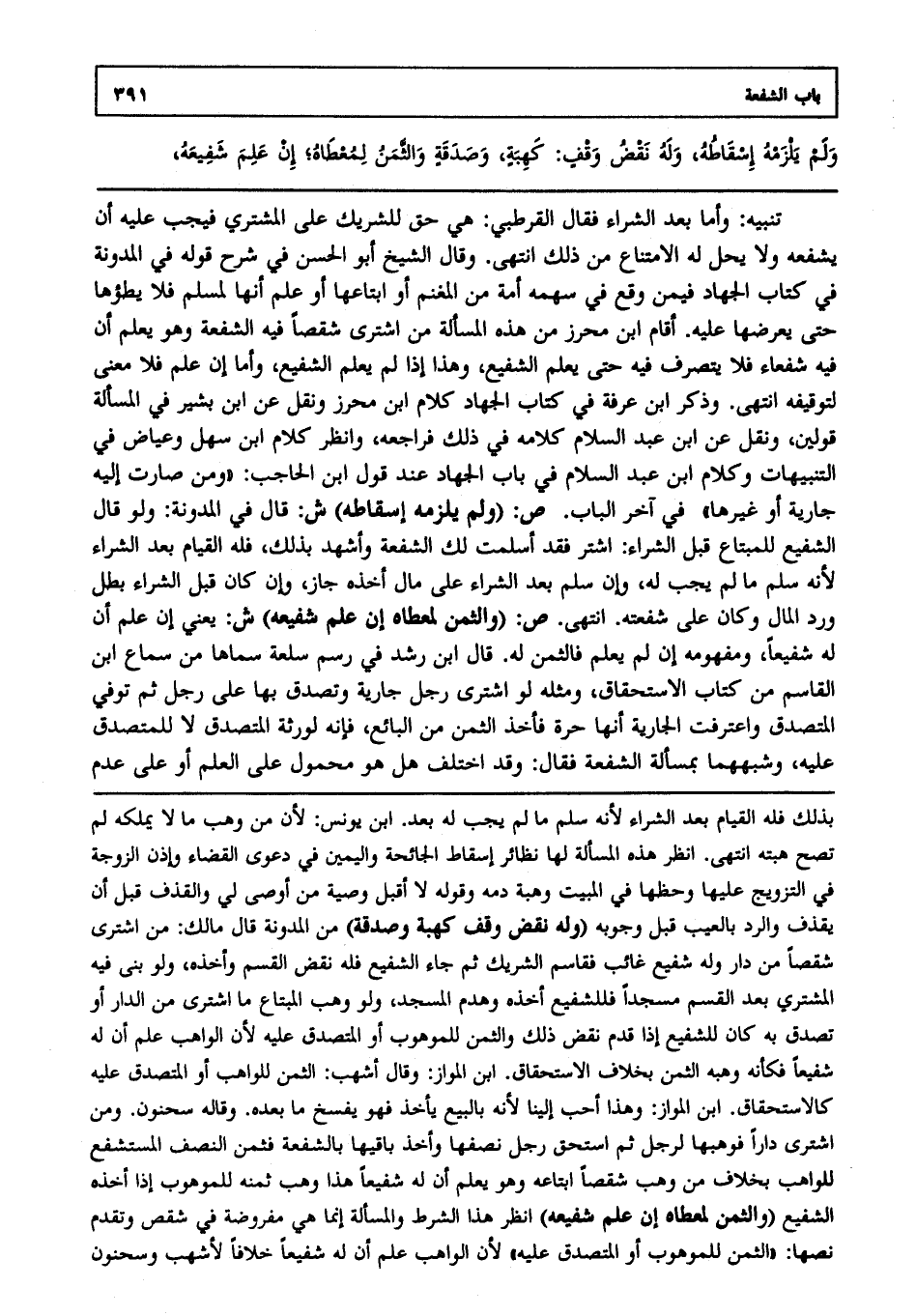 تنبيه: وأما بعد الشراء، فقال القرطبي: هي حق للشريك على المشتري فيجب عليه أن يشفعه ولا يحل له الامتناع من ذلك انتهى. وقال الشيخ أبو الحسن في شرح قوله في المدونة في كتاب الجهاد فيمن وقع في سهمه أمة من المغنم أو ابتاعها أو علم أنها لمسلم فلا يطؤها حتى يعرضها عليه أقام ابن محرز من هذه المسألة من اشترى شقصا فيه الشفعة وهو يعلم أن فيه شفعاء فلا يتصرف فيه حتى يعلم الشفيع وهذا إذا لم يعلم الشفيع وأما إن علم فلا معنى لتوقيفه، انتهى. وذكر ابن عرفة في كتاب الجهاد كلام ابن محرز ونقل عن ابن بشير في المسألة قولين ونقل عن ابن عبد السلام كلامه في ذلك فراجعه وانظر كلام ابن سهل وعياض في التنبيهات وكلام ابن عبد السلام في باب الجهاد عند قول ابن الحاجب: "ومن صارت إليه جارية أو غيرها" في آخر الباب. ص: (ولم يلزمه إسقاطه) ش: قال في المدونة: ولو قال الشفيع للمبتاع قبل الشراء: اشتر فقد أسلمت لك الشفعة وأشهد بذلك فله القيام بعد الشراء؛ لأنه سلم ما لم يجب له وإن سلم بعد الشراء على مال أخذه جاز وإن كان قبل الشراء بطل ورد المال وكان على شفعته، انتهى. ص: (والثمن لمعطاه إن علم شفيعه) ش: يعني إن علم أن له شفيعا ومفهومه إن لم يعلم فالثمن له، قال ابن رشد في رسم سلعة سماها من سماع ابن القاسم من كتاب الاستحقاق: ومثله لو اشترى رجل جارية وتصدق بها على رجل ثم توفي المتصدق واعترفت الجارية أنها حرة فأخذ الثمن من البائع فإنه لورثة المتصدق لا للمتصدق عليه وشبههما بمسألة الشفعة، فقال: وقد اختلف هل هو محمول على العلم أو على عدم