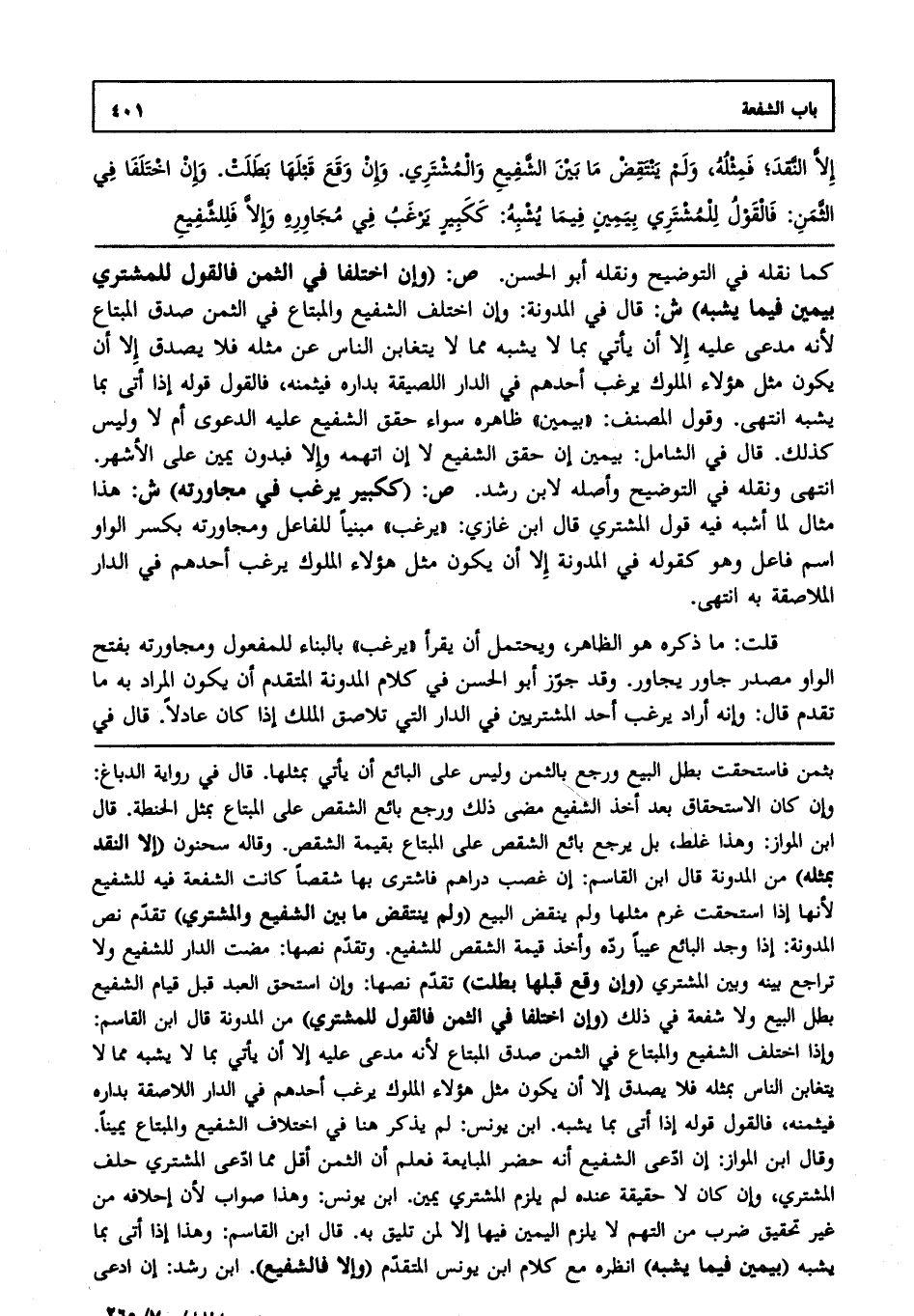 كما نقله في التوضيح ونقله أبو الحسن. ص: وإن اختلفا في الثمن فالقول للمشتري بيمين فيما يشبه) ش: قال في المدونة: وإن اختلف الشفيع والمبتاع في الثمن صدق المبتاع؛ لأنه مدعى عليه إلا أن يأتي بما لا يشبه مما لا يتغابن الناس عن مثله فلا يصدق إلا أن يكون مثل هؤلاء الملوك يرغب أحدهم في الدار اللصيقة بداره فيثمنه فالقول قوله إذا أتى بما يشبه، انتهى. وقول المصنف بيمين ظاهره سواء حقق الشفيع عليه الدعوى أم لا وليس كذلك، قال في الشامل بيمين: إن حقق الشفيع لا إن اتهمه وإلا فبدون يمين على الأشهر، انتهى. ونقله في التوضيح وأصله لابن رشد. ص: (ككبير يرغب في مجاورته) ش: هذا مثال لما أشبه فيه قول المشتري، قال ابن غازي: "يرغب" مبنيا للفاعل ومجاورته بكسر الواو اسم فاعل وهو كقوله في المدونة إلا أن يكون مثل هؤلاء الملوك يرغب أحدهم في الدار الملاصقة به، انتهى.