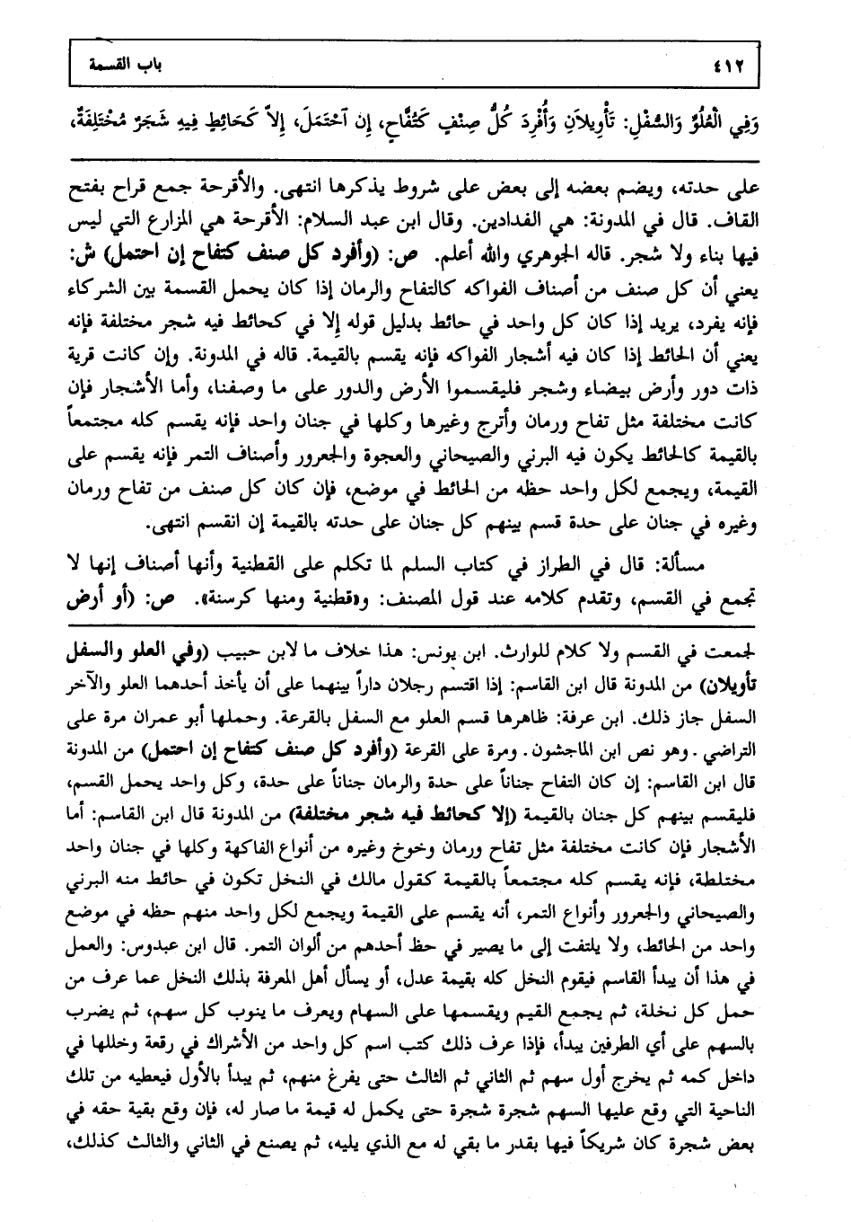 على حدته ويضم بعضه إلى بعض على شروط يذكرها، انتهى. والأقرحة جمع قراح بفتح القاف، قال في المدونة: هي الفدادين، وقال ابن عبد السلام: الأقرحة هي المزارع التي ليس فيها بناء ولا شجر، قاله الجوهري، والله أعلم. ص: (وأفرد كل صنف كتفاح إن احتمل) ش: يعني أن كل صنف من أصناف الفواكه كالتفاح والرمان إذا كان يحمل القسمة بين الشركاء فإنه يفرد يريد إذا كان كل واحد في حائط بدليل قوله إلا في كحائط فيه شجر مختلفة فإنه يعني أن الحائط إذا كان فيه أشجار الفواكه فإنه يقسم بالقيمة، قاله في المدونة وإن كانت قرية ذات دور وأرض بيضاء وشجر فليقسموا الأرض والدور على ما وصفنا وأما الأشجار فإن كانت مختلفة مثل تفاح ورمان وأترج وغيرها وكلها في جنان واحد فإنه يقسم كله مجتمعا بالقيمة كالحائط يكون فيه البرني والصيحاني والعجوة والجعرور وأصناف التمر فإنه يقسم على القيمة ويجمع لكل واحد حظه من الحائط في موضع فإن كان كل صنف من تفاح ورمان وغيره في جنان على حدة قسم بينهم كل جنان على حدته بالقيمة إن انقسم، انتهى.