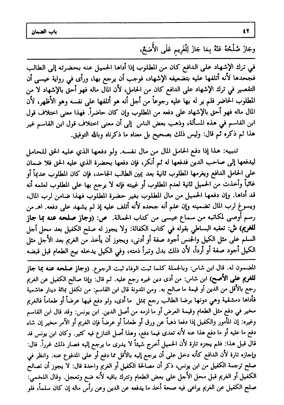 تنبيه: هذا إذا دفع الحامل المال من مال نفسه ولو دفعها الذي عليه الحق للحامل ليدفعها إلى صاحب الدين فدفعها له ثم أنكر فإن دفعها بحضرة الذي عليه الحق فلا ضمان على الحامل الدافع ويغرمها المطلوب ثانية بعد يمين الطالب الجاحد، فإن كان المطلوب عديما، أو غائبا، وأخذت من الحميل ثانية لعدم المطلوب، أو غيبته فإنه لا يرجع بها على المطلوب لعلمه أنه قد أداها، وإن دفعها الحميل من مال المطلوب بغير حضرة المطلوب فهذا ضامن لرب المال ويسوغ لرب المال تضمينه، وإن علم أنه جحده؛ لأنه أتلف عليه إذ لم يشهد على دفعه ا هـ من رسم، أوصى لمكاتبه من سماع عيسى من كتاب الحمالة. ص: (وجاز صلحه عنه بما جاز للغريم) ش: تعقبه البساطي بقولها في كتاب الكفالة: ولا يجوز له صلح الكفيل بعد محل أجل السلم على مثل الكيل والجنس أجود صفة، أو أدنى ويجوز أن يأخذ من الغريم بعد الأجل مثل الكيل أجود صفة، أو أردأ؛ لأن ذلك بدل وتبرأ ذمته وفي الكيل يدخله بيع الطعام قبل قبضه،
