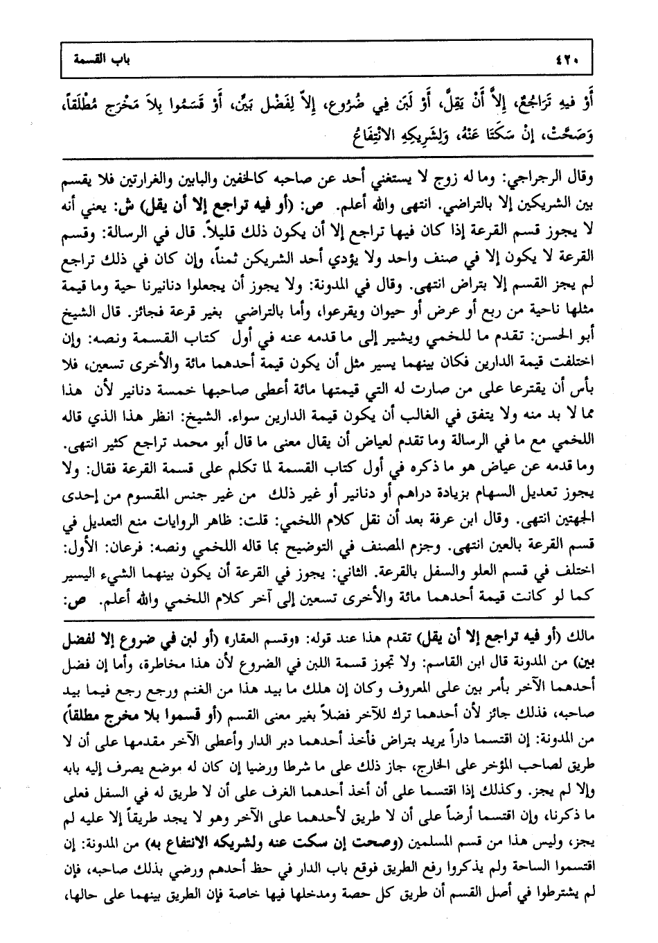 وقال الرجراجي: وما له زوج لا يستغني أحد عن صاحبه كالخفين والبابين والغرارتين فلا يقسم بين الشريكين إلا بالتراضي، انتهى، والله أعلم. ص: (أو فيه تراجع إلا أن يقل) ش: يعني أنه لا يجوز قسم القرعة إذا كان فيها تراجع إلا أن يكون ذلك قليلا، قال في الرسالة: وقسم القرعة لا يكون إلا في صنف واحد ولا يؤدي أحد الشريكين ثمنا وإن كان في ذلك تراجع لم يجز القسم إلا بتراض، انتهى. وقال في المدونة: ولا يجوز أن يجعلوا دنانير ناحية وما قيمة مثلها ناحية من ربع أو عرض أو حيوان ويقرعوا وأما بالتراضي بغير قرعة فجائز، قال الشيخ أبو الحسن: تقدم ما للخمي ويشير إلى ما قدمه عنه في أول كتاب القسمة ونصه: وإن اختلفت قيمة الدارين فكان بينهما يسير مثل أن يكون قيمة أحدهما مائة والأخرى تسعين فلا بأس أن يقترعا على من صارت له التي قيمتها مائة أعطى صاحبها خمسة دنانير؛ لأن هذا مما لا بد منه ولا يتفق في الغالب أن يكون قيمة الدارين سواء. الشيخ. انظر هذا الذي قاله اللخمي مع ما في الرسالة وما تقدم لعياض أن يقال معنى ما قال أبو محمد: تراجع كثير، انتهى. وما قدمه عن عياض هو ما ذكره في أول كتاب القسمة لما تكلم على قسمة القرعة، فقال: ولا يجوز تعديل السهام بزيادة دراهم أو دنانير أو غير ذلك من غير جنس المقسوم من إحدى الجهتين، انتهى. وقال ابن عرفة بعد أن نقل كلام اللخمي قلت: ظاهر الروايات منع التعديل في قسم القرعة بالعين، انتهى. وجزم المصنف في التوضيح بما قاله اللخمي ونصه: فرعان، الأول: اختلف في قسم العلو والسفل بالقرعة، الثاني: يجوز في القرعة أن يكون بينهما الشيء اليسير كما لو كانت قيمة أحدهما مائة والأخرى تسعين إلى آخر كلام اللخمي، والله أعلم. ص: