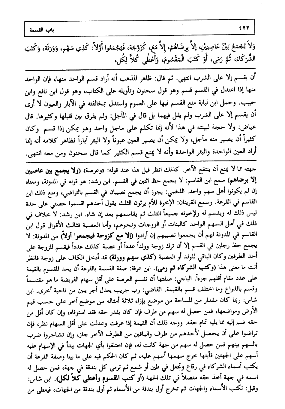 أن يقسم إلا على الشرب، انتهى. ثم قال: ظاهر المذهب أنه أراد قسم الواحد منها فإن الواحد منها إذا اعتدل في القسم قسم وهو قول سحنون وتأويله على الكتاب وهو قول ابن نافع وابن حبيب وحمل ابن لبابة منع القسم فيها على العموم واستدل بمخالفته في الآبار والعيون ولا أرى أن يقسم إلا على الشرب ولم يقل فيهما بل قال في المآجل ولم يفرق بين قليلها وكثيرها، قال عياض: ولا حجة لبينته في هذا؛ لأنه إنما تكلم على ماجل واحد وهو يمكن إذا قسم وكان كثيرا أن يصير منه مآجل ولا يمكن أن يصير العين عيونا ولا البئر آبارا فظاهر كلامه أنه إنما أراد العين الواحدة والبئر الواحدة وأنه لا يمنع قسم الكثير كما، قال سحنون ومن معه، انتهى.