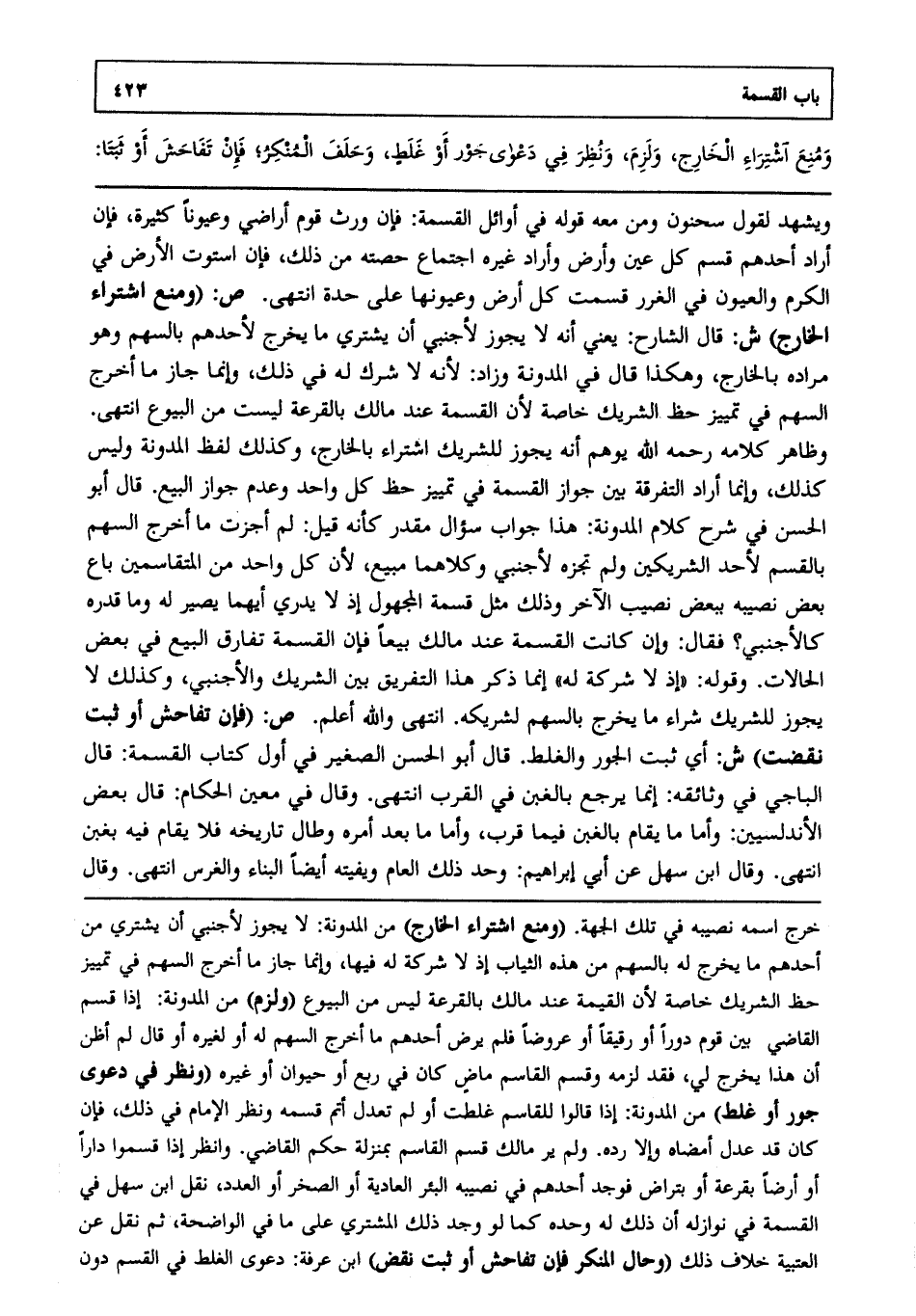 ويشهد لقول سحنون ومن معه قوله في أوائل القسمة فإن ورث قوم أراضي وعيونا كثيرة فإن أراد أحدهم قسم كل عين وأرض وأراد غيره اجتماع حصته من ذلك فإن استوت الأرض في الكرم والعيون في الغرر قسمت كل أرض وعيونها على حدة، انتهى. ص: (ومنع اشتراء الخارج) ش: قال الشارح: يعني أنه لا يجوز لأجنبي أن يشتري ما يخرج لأحدهم بالسهم وهو مراده بالخارج وهكذا قال في المدونة وزاد؛ لأنه لا شرك له في ذلك وإنما جاز ما أخرج السهم في تمييز حظ الشريك خاصة؛ لأن القسمة عند مالك بالقرعة ليست من البيوع، انتهى. وظاهر كلامه رحمه الله يوهم أنه يجوز للشريك اشتراء الخارج وكذلك لفظ المدونة وليس كذلك وإنما أراد التفرقة بين جواز القسمة في تمييز حظ كل واحد وعدم جواز البيع، قال أبو الحسن في شرح كلام المدونة: هذا جواب سؤال مقدر كأنه قيل: لم أجزت ما أخرج السهم بالقسم لأحد الشريكين ولم تجزه لأجنبي وكلاهما مبيع؛ لأن كل واحد من المتقاسمين باع بعض نصيبه ببعض نصيب الآخر وذلك مثل قسمة المجهول؛ إذ لا يدري أيهما يصير له وما قدره كالأجنبي، فقال: وإن كانت القسمة عند مالك بيعا فإن القسمة تفارق البيع في بعض الحالات وقوله: "إذ لا شركة له" إنما ذكر هذا التفريق بين الشريك والأجنبي وكذلك لا يجوز للشريك شراء ما يخرج بالسهم لشريكه، انتهى. والله أعلم. ص: (فإن تفاحش أو ثبت نقضت) ش: أي ثبت الجور والغلط، قال أبو الحسن الصغير في أول كتاب القسمة، قال الباجي في وثائقه: إنما يرجع بالغبن في القرب، انتهى. وقال في معين الحكام، قال بعض الأندلسيين: وأما ما يقام بالغبن فيما قرب وأما ما بعد أمره وطال تاريخه فلا يقام فيه بغبن، انتهى. وقال ابن سهل عن أبي إبراهيم: وحد ذلك العام ويفيته أيضا البناء والغرس، انتهى. وقال