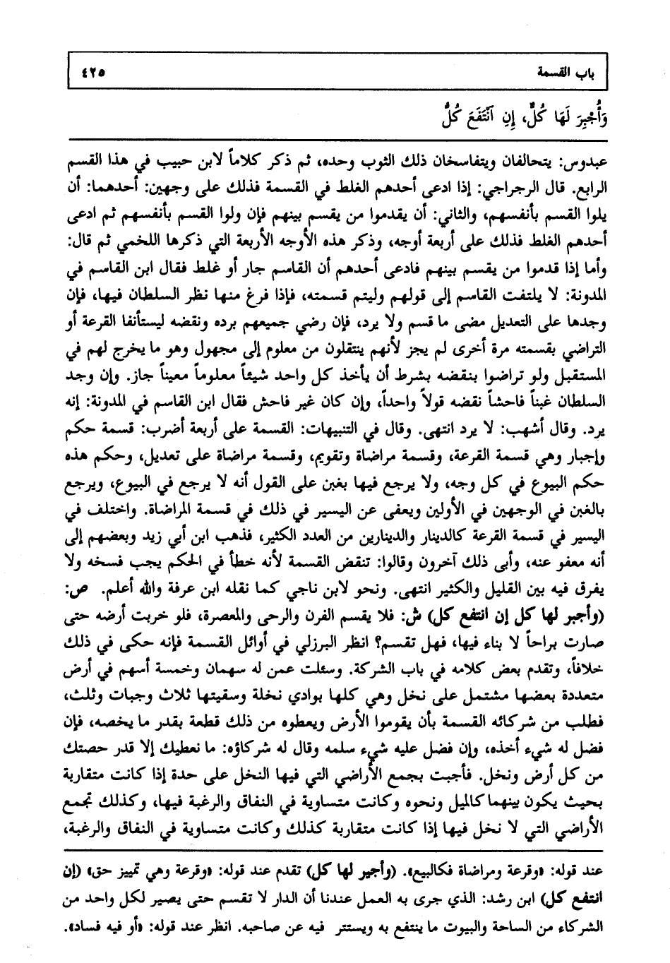 عبدوس: يتحالفان ويتفاسخان ذلك الثوب وحده ثم ذكر كلاما لابن حبيب في هذا. القسم الرابع: قال الرجراجي: إذا ادعى أحدهم الغلط في القسمة فذلك على وجهين، أحدهما: أن يلوا القسم بأنفسهم، والثاني: أن يقدموا من يقسم بينهم فإن تولوا القسم بأنفسهم ثم ادعى أحدهم الغلط فذلك على أربعة أوجه وذكر هذه الأوجه الأربعة التي ذكرها اللخمي ثم قال: وأما إذا قدموا من يقسم بينهم فادعى أحدهم أن القاسم جار أو غلط، فقال ابن القاسم في المدونة: لا يلتفت القاسم إلى قولهم وليتم قسمته فإذا فرغ منها نظر السلطان فيها فإن وجدها على التعديل مضى ما قسم ولا يرد فإن رضي جميعهم برده ونقضه ليستأنفا القرعة أو التراضي بقسمته مرة أخرى لم يجز؛ لأنهم ينتقلون من معلوم إلى مجهول وهو ما يخرج لهم في المستقبل ولو تراضوا بنقضه بشرط أن يأخذ كل واحد شيئا معلوما معينا جاز وإن وجد السلطان غبنا فاحشا نقضه قولا واحدا وإن كان غير فاحش، فقال ابن القاسم في المدونة: إنه يرد، وقال أشهب: لا يرد، انتهى. وقال في التنبيهات: القسمة على أربعة أضرب: قسمة حكم، وإجبار وهي قسمة القرعة، وقسمة مراضاة وتقويم، وقسمة مراضاة على تعديل وحكم هذه حكم البيوع في كل وجه ولا يرجع فيها بغبن على القول أنه لا يرجع في البيوع ويرجع بالغبن في الوجهين الأولين ويعفى عن اليسير في ذلك في قسمة المراضاة واختلف في اليسير في قسمة القرعة كالدينار والدينارين من العدد الكثير فذهب ابن أبي زيد وبعضهم إلى أنه معفو عنه وأبى ذلك آخرون وقالوا تنقض القسمة؛ لأنه خطأ في الحكم يجب فسخه ولا يفرق فيه بين القليل والكثير، انتهى. ونحوه لابن ناجي كما نقله ابن عرفة، والله أعلم. ص: (وأجبر لها كل إن انتفع كل) ش: فلا يقسم الفرن والرحى والمعصرة فلو خربت أرضه حتى صارت براحا لا بناء فيها فهل تقسم؟ انظر البرزلي في أوائل القسمة فإنه حكى في ذلك خلافا وتقدم بعض كلامه في باب الشركة وسئلت عمن له سهمان وخمسة أسهم في أرض متعددة بعضها مشتمل على نخل وهي كلها بوادي نخلة وسقيتها ثلاث وجبات وثلث فطلب من شركائه القسمة بأن يقوموا الأرض ويعطوه من ذلك قطعة بقدر ما يخصه فإن فضل له شيء أخذه وإن فضل عليه شيء سلمه، وقال له شركاؤه: ما نعطيك إلا قدر حصتك من كل أرض ونخل فأجبت بجمع الأراضي التي فيها النخل على حدة إذا كانت متقاربة بحيث يكون بينهما كالميل ونحوه وكانت متساوية في النفاق والرغبة فيها وكذلك تجمع الأراضي التي لا نخل فيها إذا كانت متقاربة كذلك وكانت متساوية في النفاق والرغبة