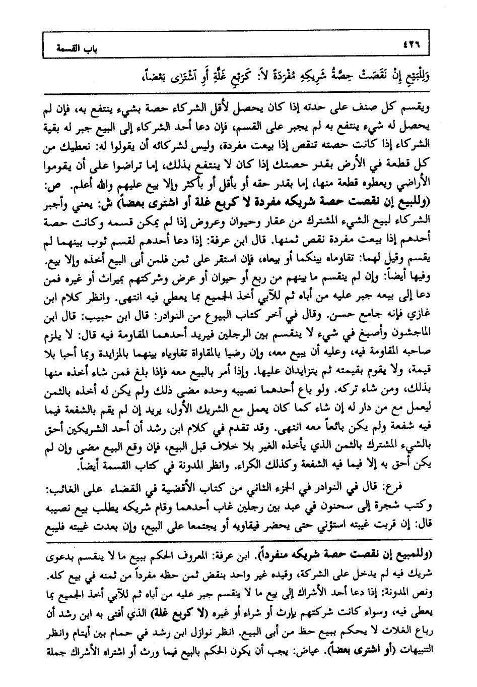 ويقسم كل صنف على حدته إذا كان يحصل لأقل الشركاء حصة بشيء ينتفع به فإن لم يحصل له شيء ينتفع به لم يجبر على القسم فإن دعا أحد الشركاء إلى البيع جبر له بقية الشركاء إذا كانت حصته تنقص إذا بيعت مفردة وليس لشركائه أن يقولوا له نعطيك من كل قطعة في الأرض بقدر حصتك إذا كان لا ينتفع بذلك إما تراضوا على أن يقوموا الأراضي ويعطوه قطعة منها إما بقدر حقه أو بأقل أو بأكثر وإلا بيع عليهم، والله أعلم. ص: (وللبيع إن نقصت حصة شريكه مفردة لا كربع غلة أو اشترى بعضا) ش: يعني وأجبر الشركاء لبيع الشيء المشترك من عقار وحيوان وعروض إذا لم يمكن قسمه وكانت حصة أحدهم إذا بيعت مفردة نقص ثمنها، قال ابن عرفة: إذا دعا أحدهم لقسم ثوب بينهما لم يقسم وقيل لهما: تقاوماه بينكما أو بيعاه فإن استقر على ثمن فلمن أبى البيع أخذه وإلا بيع وفيها أيضا وإن لم ينقسم ما بينهم من ربع أو حيوان أو عرض وشركتهم بميراث أو غيره فمن دعا إلى بيعه جبر عليه من أباه ثم للآبي أخذ الجميع بما يعطى فيه، انتهى. وانظر كلام ابن غازي فإنه جامع حسن، وقال في آخر كتاب البيوع من النوادر، قال ابن حبيب، قال ابن الماجشون وأصبغ في الشيء لا ينقسم بين الرجلين فيريد أحدهما المقاومة فيه، قال: لا يلزم صاحبه المقاومة فيه وعليه أن يبيع معه وإن رضيا بالمقاواة تقاوياه بينهما بالمزايدة وبما أحبا بلا قيمة ولا يقوم بقيمته ثم يتزايدان عليها وإذا أمر بالبيع معه فإذا بلغ فمن شاء أخذه منها بذلك ومن شاء تركه ولو باع أحدهما نصيبه وحده مضى ذلك ولم يكن له أخذه بالثمن ليعمل مع من دار له إن شاء كما كان يعمل مع الشريك الأول يريد إن لم يقم بالشفعة فيما فيه شفعة ولم يكن بائعا معه، انتهى. وقد تقدم في كلام ابن رشد أن أحد الشريكين أحق بالشيء المشترك بالثمن الذي يأخذه الغير بلا خلاف قبل البيع فإن وقع البيع مضى وإن لم يكن أحق به إلا فيما فيه الشفعة وكذلك الكراء وانظر المدونة في كتاب القسمة أيضا.
