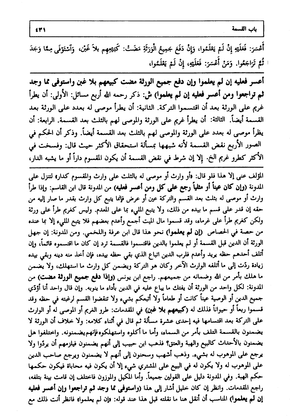 أعسر فعليه إن لم يعلموا وإن دفع جميع الورثة مضت كبيعهم بلا غبن واستوفى مما وجد ثم تراجعوا ومن أعسر فعليه إن لم يعلموا) ش: ذكر رحمه الله أربع مسائل، الأولى: أن يطرأ غريم على الورثة بعد أن اقتسموا التركة. الثانية: أن يطرأ موصى له بعدد على الورثة بعد القسمة أيضا، الثالثة: أن يطرأ غريم على الورثة والموصى لهم بالثلث بعد القسمة، الرابعة: أن يطرأ موصى له بعدد على الورثة والموصى لهم بالثلث بعد القسمة أيضا، وذكر أن الحكم في الصور الأربع نقض القسمة؛ لأنه شبهها بمسألة استحقاق الأكثر حيث قال: وفسخت في الأكثر كطرو غريم إلخ، إلا إن شرط في نقض القسمة أن يكون المقسوم دارا أو ما يشبه الدار
