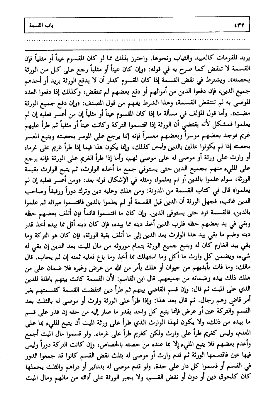 يريد المقومات كالعبيد والثياب ونحوها واحترز بذلك مما لو كان المقسوم عينا أو مثليا فإن القسمة لا تنقض كما صرح به في قوله: "وإن كان عينا أو مثليا رجع على كل من الورثة بحصته". ويشترط في نقض القسمة إذا كان المقسوم كدار أن لا يدفع الورثة يريد أو أحدهم جميع الدين فإن دفعوا الدين من أموالهم أو دفع بعضهم لم تنتقض وكذلك إذا دفعوا العدد الموصى به لم تنتقض القسمة وهذا الشرط يفهم من قول المصنف: "وإن دفع جميع الورثة مضت" وأما قول المؤلف في مسألة ما إذا كان المقسوم عينا أو مثليا أن من أعسر فعليه إن لم يعلموا فمشكل؛ لأنه يقتضي أن الورثة إذا اقتسموا التركة وكانت عينا أو مثليا ثم طرأ عليهم غريم فوجد بعضهم موسرا وبعضهم معسرا فإنه إنما يرجع على الموسر بحصته ويتبع المعسر بحصته إذا لم يكونوا عالمين بالدين وليس كذلك وإنما يكون هذا فيما إذا طرأ غريم على غرماء أو وارث على ورثة أو موصى له على موصى لهم وأما إذا طرأ الغريم على الورثة فإنه يرجع على المليء منهم بجميع الدين حتى يستوفي جميع ما أخذه الوارث ثم يتبع الوارث بقية الورثة سواء علموا بالدين أو لم يعلموا ومثله في الإشكال قوله بعد: "ومن أعسر فعليه إن لم يعلموا" قال في كتاب القسمة من المدونة: ومن هلك وعليه دين وترك دورا ورقيقا وصاحب الدين غائب فجهل الورثة أن الدين قبل القسمة أو لم يعلموا بالدين فاقتسموا ميراثه ثم علموا بالدين فالقسمة ترد حتى يستوفى الدين إن كان ما اقتسموا قائما فإن أتلف بعضهم حظه وبقي في يد بعضهم حظه فلرب الدين أخذ دينه مما بيده فإن كان دينه أقل مما بيده أخذ قدر دينه وضم ما بقي بيد هذا الوارث بعد الدين إلى ما أتلف بقية الورثة فإن كان هو التركة وما بقي بيد الغارم كان له ويتبع جميع الورثة بتمام موروثه من مال الميت بعد الدين إن بقي له شيء ويضمن كل وارث ما أكل وما استهلك مما أخذ وما باع فعليه ثمنه إن لم يحاب، قال مالك: وما فات بأيديهم من حيوان أو هلك بأمر من الله من عرض وغيره فلا ضمان على من هلك ذلك بيده وضمانه من جميعهم، قال ابن القاسم: لأن القسمة كانت بينهم باطلة للدين الذي على الميت ثم قال: وإن قسم القاضي بينهم ثم طرأ دين انتقضت القسمة كقسمتهم بغير أمر قاض وهم رجال ثم قال بعد هذا: وإذا طرأ على الورثة وارث أو موصى له بالثلث بعد القسم والتركة عين أو عرض فإنما يتبع كل واحد بقدر ما صار إليه من حقه إن قدر على قسم ما بيده من ذلك ولا يكون لهذا الوارث الذي طرأ على ورثة الميت أن يتبع المليء بما على المعدم وليس كغريم طرأ على وارث ولكن كغريم طرأ على غرماء ولو قسموا مال الميت أجمع وأعدم بعضهم فلا يتبع المليء إلا بما عنده من حصته بالحصاص وإن كانت التركة دورا وليس فيها عين فاقتسمها الورثة ثم قدم وارث أو موصى له بثلث نقض القسم كانوا قد جمعوا الدور في القسم أو قسموا كل دار على حدة ولو قدم موصى له بدنانير أو دراهم والثلث يحملها كان كلحوق دين أدون أو نقض القسم ولا يجبر الورثة على أدائه من مالهم ومال الميت