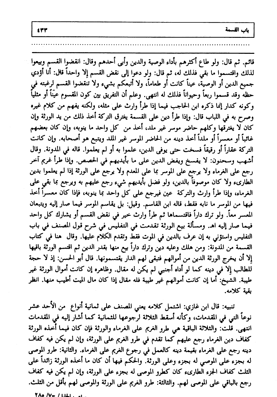 قائم ثم قال: ولو طاع أكثرهم بأداء الوصية والدين وأبى أحدهم، وقال: انقضوا القسم وبيعوا لذلك واقتسموا ما بقي فذلك له ثم قال: ولو دعوا إلى نقض القسم إلا واحدا، قال: أنا أؤدي جميع الدين أو الوصية عينا كانت أو طعاما ولا أتبعكم بشيء ولا تنقضوا القسم لرغبته في حظه وقد قسموا ربعا وحيوانا فذلك له، انتهى. وعلم أن التفريق بين كون المقسوم عينا أو مثليا. وكونه كدار إنما ذكره ابن الحاجب فيما إذا طرأ وارث على مثله ولكنه يفهم من كلام غيره وصرح به في اللباب قال: وإذا طرأ دين على القسمة يغترق التركة أخذ ذلك من يد الورثة وإن كان لا يغترقها وكلهم حاضر موسر غير ملد أخذ من كل واحد ما ينوبه وإن كان بعضهم غائبا أو معسرا أو ملدا أخذ دينه من الحاضر الموسر غير الملد ويتبع هو أصحابه وإن كانت التركة عقارا أو رقيقا فسخت حتى يوفى الدين علموا به أو لم يعلموا. قاله في المدونة وقال أشهب وسحنون: لا يفسخ ويفض الدين على ما بأيديهم في الحصص وإذا طرأ غريم آخر رجع على الغرماء ولا يرجع على الموسر بما على المعدم ولا يرجع على الورثة إذا لم يعلموا بدين الطارئ ولا كان موصوفا بالدين ولو فضل بأيديهم شيء رجع عليهم به ويرجع بما بقي على الغرماء وإذا طرأ وارث والتركة عين فيرجع على كل واحد بما ينوبه فإذا كان معسرا أخذ فيها من الموسر ما نابه فقط قاله ابن القاسم وقيل: بل يقاسم الموسر فيما صار إليه ويتبعان المعسر معا ولو ترك دارا فاقتسماها ثم طرأ وارث خير في نقض القسم أو يشارك كل واحد فيما صار إليه ا هـ ومسألة بيع الورثة تقدمت في التفليس في شرح قول المصنف في باب التفليس واستؤني به إن عرف بالدين في الموت فقط وتقدم الكلام عليها وقال هنا في كتاب القسمة من المدونة ومن هلك وعليه دين وترك دارا بيع منها بقدر الدين ثم اقتسم الورثة باقيها إلا أن يخرج الورثة الدين من أموالهم فتبقى لهم الدار يقتسمونها قال أبو الحسن: إذ لا حجة للطالب إلا في دينه كما لو أداه أجنبي لم يكن له مقال وظاهره إن كانت أموال الورثة غير طيبة، الشيخ. أما إن كانت أموالهم غير طيبة فله مقال إذا كان مال الميت أطيب منها انظر بقية كلامه.