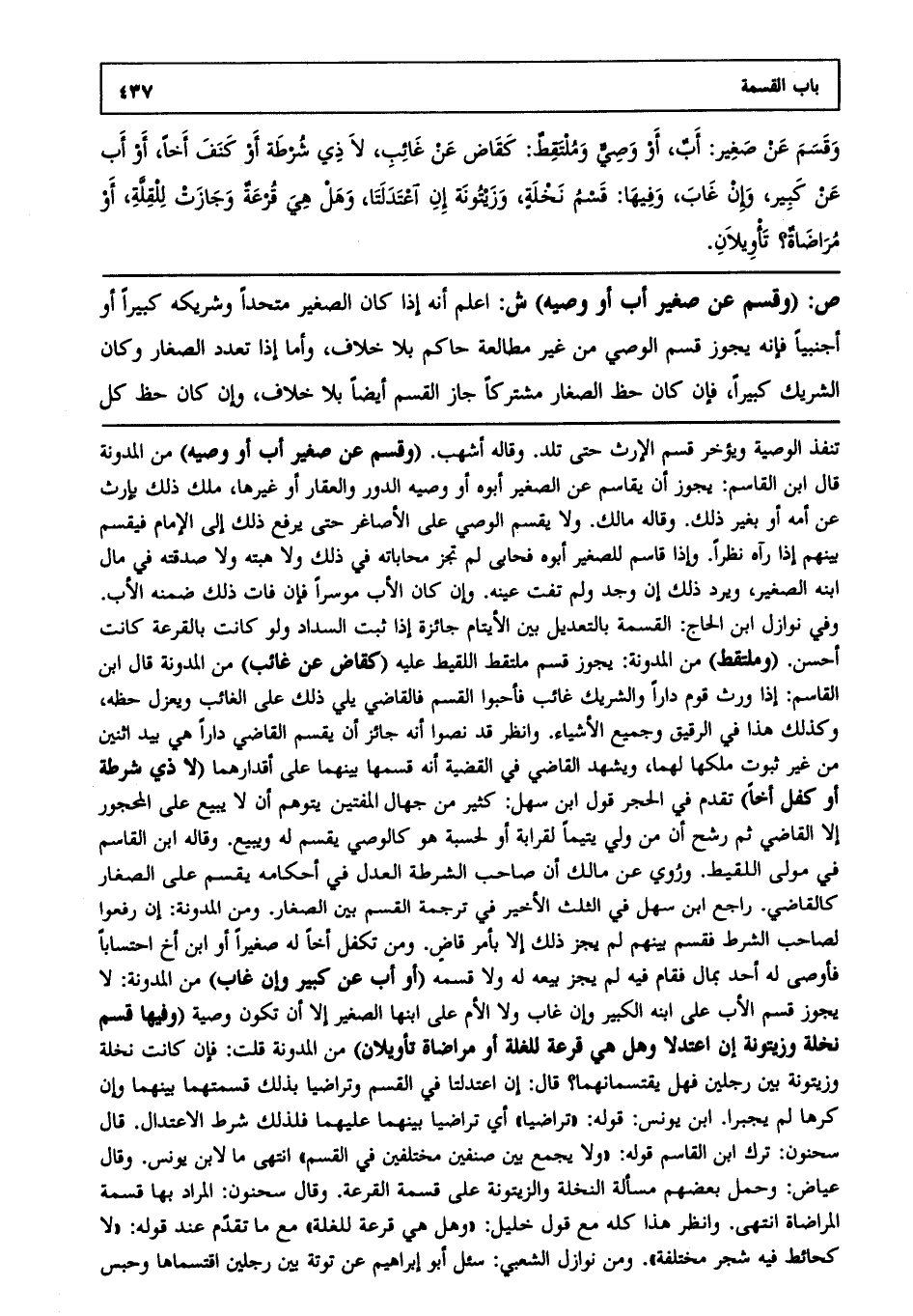 وقسم عن صغير: أب، أو وصي وملتقط: كقاض عن غائب، لا ذي شرطة أو كنف أخا، أو أب عن كبير، وإن غاب، وفيها: قسم نخلة، وزيتونة إن اعتدلتا، وهل هي قرعة وجازت للقلة، أو مراضاة؟ تأويلان.