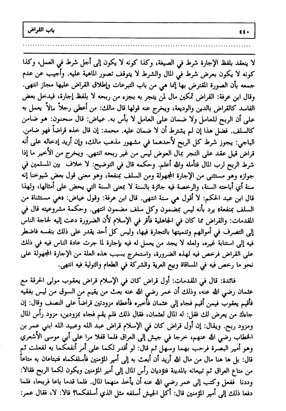فائدة: قال في المقدمات: أول قراض كان في الإسلام قراض يعقوب مولى الحرقة مع عثمان رضي الله عنه، وذلك أن عمر رضي الله عنه بعث من يقيم من السوق من ليس بفقيه فأقيم يعقوب فيمن أقيم فجاء إلى عثمان فأخبره فأعطاه مزودتين قراضا على النصف، وقال: إن جاءك من يعرض لك فقل له: المال لعثمان فقال ذلك فلم يقم فجاء بمزودين مزود رأس المال ومزود ربح، ويقال: إن أول قراض كان في الإسلام قراض عبد الله وعبيد الله ابني عمر بن الخطاب رضي الله عنهم خرجا في جيش إلى العراق فلما قفلا مرا على أبي موسى الأشعري، وهو أمير البصرة فرحب بهما، وسهل، ثم قال: لو أقدر لكما على أمر أنفعكما به لفعلت، ثم قال: بل هاهنا مال من مال الله أريد أن أبعث به إلى أمير المؤمنين فأسلفكماه فتبتاعان به متاعا من متاع العراق، ثم تبيعانه بالمدينة فتؤديان رأس المال إلى أمير المؤمنين، ويكون لكما الربح فقالا: وددنا، ففعل وكتب إلى عمر رضي الله عنه أن يأخذ منهما المال، فلما قدما باعا فربحا فلما دفعا ذلك إلى أمير المؤمنين قال: أكل الجيش أسلفه مثل الذي أسلفكما؟ قالا: لا، فقال عمر: