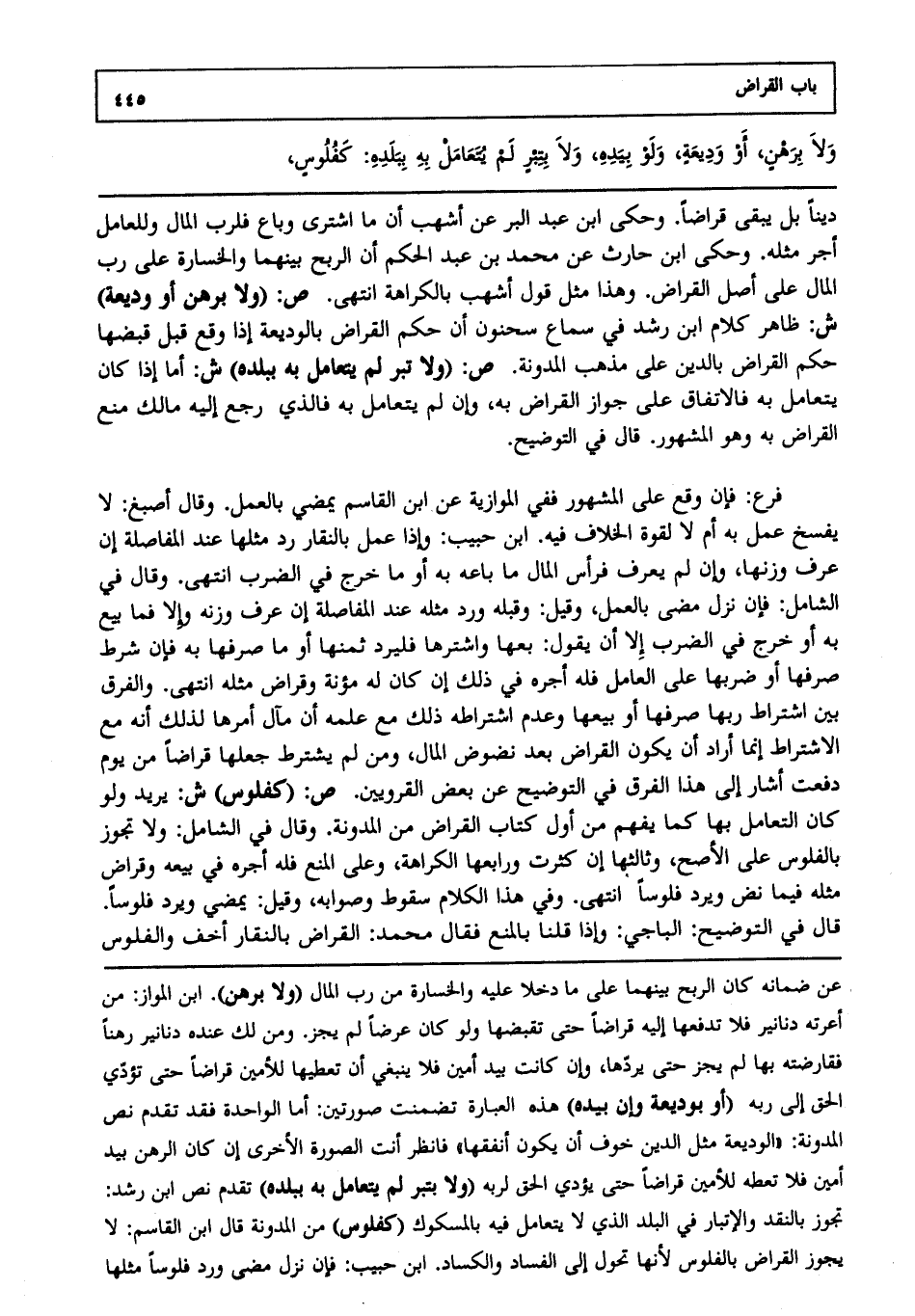 فرع: فإن وقع على المشهور ففي الموازية عن ابن القاسم يمضي بالعمل، وقال أصبغ: لا يفسخ عمل به أم لا لقوة الخلاف فيه ابن حبيب، وإذا عمل بالنقار رد مثلها عند المفاصلة إن عرف وزنها، وإن لم يعرف فرأس المال ما باعه به أو ما خرج في الضرب انتهى. وقال في الشامل: فإن نزل مضى بالعمل، وقيل: وقبله: ورد مثله عند المفاصلة إن عرف وزنه وإلا فما بيع به أو خرج في الضرب إلا أن يقول: بعها واشترها فليرد ثمنها أو ما صرفها به، فإن شرط صرفها أو ضربها على العامل فله أجره في ذلك إن كان له مؤنة وقراض مثله انتهى. والفرق بين اشتراط ربها صرفها أو بيعها وعدم اشتراطه لذلك مع علمه أن مآل أمرها لذلك أنه مع الاشتراط إنما أراد أن يكون القراض بعد نضوض المال، ومن لم يشترط جعلها قراضا من يوم دفعت أشار إلى هذا الفرق في التوضيح عن بعض القرويين. ص: (كفلوس) ش: يريد، ولو كان التعامل بها كما يفهم من أول كتاب القراض من المدونة، وقال في الشامل: ولا تجوز بالفلوس على الأصح وثالثها: إن كثرت، ورابعها: الكراهة، وعلى المنع فله أجره في بيعه، وقراض مثله فيما نض ويرد فلوسا انتهى. وفي هذا الكلام سقوط، وصوابه، وقيل: يمضي ويرد فلوسا قال في التوضيح الباجي، وإذا قلنا بالمنع فقال محمد: القراض بالنقار أخف والفلوس