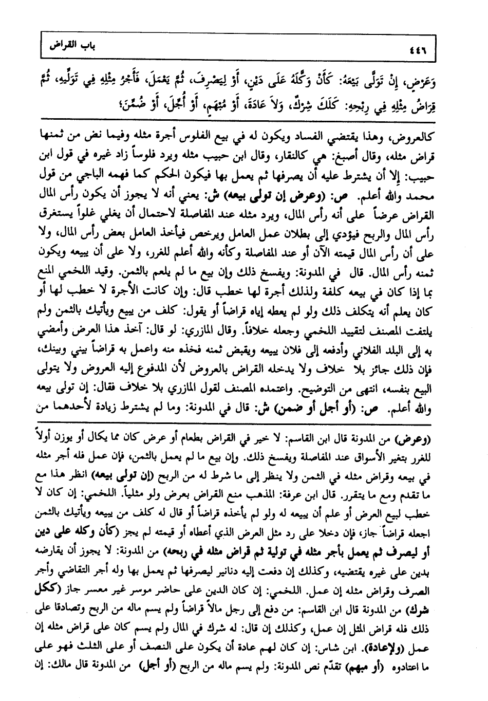 كالعروض، وهذا يقتضي الفساد، ويكون له في بيع الفلوس أجرة مثله، وفيما نض من ثمنها قراض مثله، وقال أصبغ: هي كالنقار، وقال ابن حبيب مثله ويرد فلوسا زاد غيره في قول ابن حبيب إلا أن يشترط عليه أن يصرفها، ثم يعمل بها، فيكون الحكم كما فهمه الباجي من قول محمد والله أعلم ص: (وعرض إن تولى بيعه) ش: يعني أنه لا يجوز أن يكون رأس مال القراض عرضا على أنه رأس المال ويرد مثله عند المفاصلة لاحتمال أن يغلو غلوا يستغرق رأس المال والربح فيؤدي إلى بطلان عمل العامل ويرخص فيأخذ العامل بعض رأس المال، ولا على أن رأس المال قيمته الآن أو عند المفاصلة وكأنه - والله أعلم - للغرر، ولا على أن يبيعه، ويكون ثمنه رأس المال قال في المدونة: ويفسخ ذلك، وإن بيع ما لم يعلم بالثمن، وقيد اللخمي المنع بما إذا كان في بيعه كلفة ولذلك أجرة لها خطب قال: وإن كانت الأجرة لا خطب لها أو كان يعلم أنه يتكلف ذلك، ولو لم يعطه إياه قراضا، أو يقول كلف من يبيع ويأتيك بالثمن، ولم يلتفت المصنف لتقييد اللخمي وجعله خلافا، وقال المازري: لو قال: آخذ هذا العرض وأمضي به إلى البلد الفلاني وأدفعه إلى فلان يبيعه ويقبض ثمنه فخذه منه واعمل به قراضا بيني وبينك فإن ذلك جائز بلا خلاف، ولا يدخله القراض بالعروض؛ لأن المدفوع إليه العروض، ولا يتولى البيع بنفسه انتهى من التوضيح، واعتمده المصنف لقول المازري: بلا خلاف فقال: إن تولى بيعه، والله أعلم. ص: (أو أجّل أو ضمن) ش: قال في المدوّنة وما لم يشترط زيادة لأحدهما من