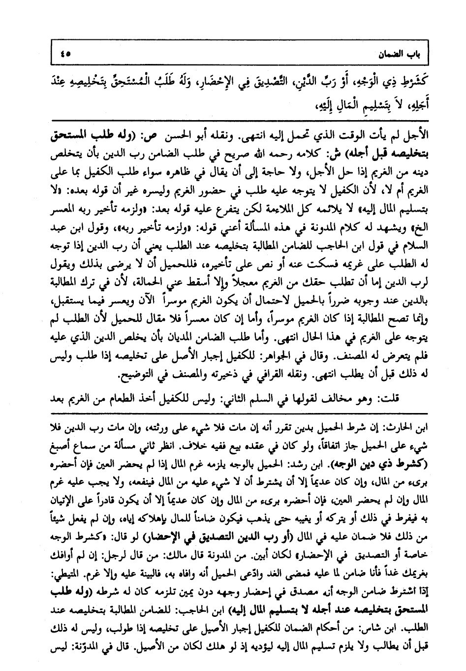 الأجل لم يأت الوقت الذي تحمل إليه انتهى ونقله أبو الحسن. ص: (وله طلب المستحق بتخليصه قبل أجله) ش: كلامه رحمه الله صريح في طلب الضامن رب الدين بأن يتخلص دينه من الغريم إذا حل الأجل ولا حاجة إلى أن يقال فيه ظاهره سواء طلب الكفيل بما على الغريم أم لا؛ لأن الكفيل لا يتوجه عليه طلب في حضور الغريم وليسره غير أن قوله بعده: "لا بتسليم المال إليه" لا يلائمه كل الملاءمة لكن يتفرع عليه قوله بعد: "ولزمه تأخير ربه المعسر إلخ" ويشهد له كلام المدونة في هذه المسألة أعني قوله: "ولزمه تأخير ربه" وقول ابن عبد السلام في قول ابن الحاجب: للضامن المطالبة بتخليصه عند الطلب يعني أن رب الدين إذا توجه له الطلب على غريمه فسكت عنه، أو نص على تأخيره فللحميل أن لا يرضى بذلك، ويقول لرب الدين إما أن تطلب حقك من الغريم معجلا وإلا أسقط عني الحمالة؛ لأن في ترك المطالبة بالدين عند وجوبه ضررا بالحميل لاحتمال أن يكون الغريم موسرا الآن ويعسر فيما يستقبل، وإنما تصح المطالبة إذا كان الغريم موسرا وأما إن كان معسرا فلا مقال للحميل، لأن الطلب لم يتوجه على الغريم في هذا الحال انتهى وأما طلب الضامن المديان بأن يخلص الدين الذي عليه فلم يتعرض له المصنف، وقال في الجواهر: للكفيل إجبار الأصل على تخليصه إذا طلب وليس له ذلك قبل أن يطلب انتهى ونقله القرافي في ذخيرته والمصنف في التوضيح.