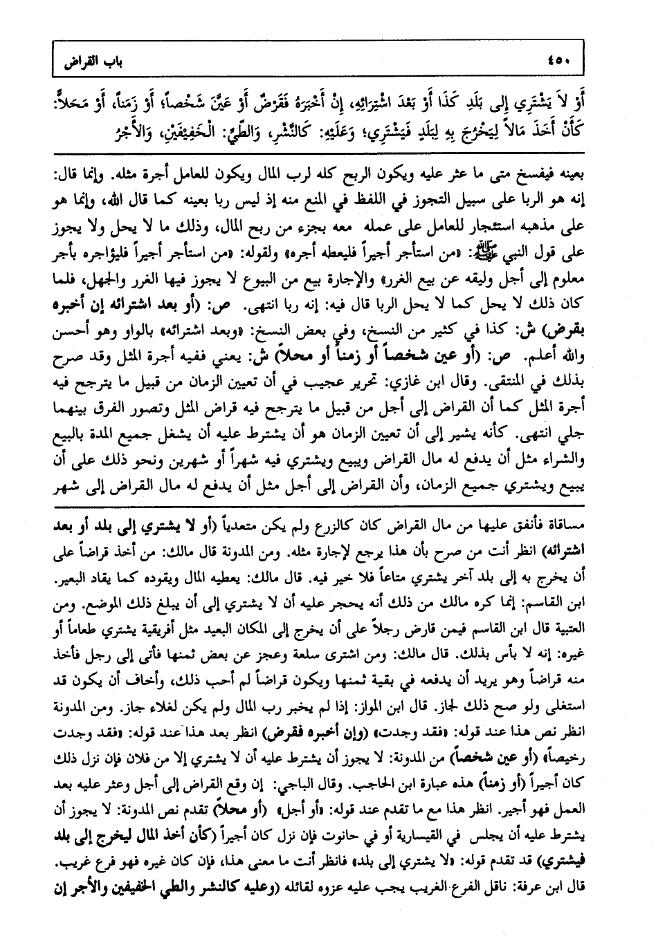 بعينه فيفسخ متى ما عثر عليه، ويكون الرّبح كلّه لربّ المال، ويكون للعامل أجرة مثله، وإنّما قال: إنّه هو الرّبا على سبيل التّجوّز في اللّفظ في المنع منه؛ إذ ليس ربا بعينه كما قال اللّه، وإنّما هو على مذهبه استئجار للعامل على عمله معه بجزء من ربح المال، وذلك ما لا يحلّ، ولا يجوز على قول النّبيّ صلى الله عليه وسلم: "من استأجر أجيرا فليعطه أجره" ولقوله: "من استأجر أجيرا فليؤاجره بأجر معلوم إلى أجل وليقه عن بيع الغرر" والإجارة بيع من البيوع لا يجوز فيها الغرر والجهل، فلمّا كان ذلك لا يحلّ كما لا يحلّ الرّبا قال فيه: إنّه ربا انتهى. ص: (أو بعد اشترائه إن أخبره بقرض) ش: كذا في كثير من النّسخ، وفي بعض النّسخ، "وبعد اشترائه" بالواو، وهو أحسن، واللّه أعلم. ص: (أو عيّن شخصا أو زمنا أو محلّا) ش: يعني ففيه أجرة المثل، وقد صرّح بذلك في المنتقى، وقال ابن غازيّ: تحرير عجيب في أنّ تعيين الزّمان من قبيل ما يترجّح فيه أجرة المثل كما أنّ القراض إلى أجل من قبيل ما يترجّح فيه قراض المثل، وتصوّر الفرق بينهما جليّ انتهى. كأنّه يشير إلى أنّ تعيين الزّمان هو أن يشترط عليه أن يشغل جميع المدّة بالبيع والشّراء مثل أن يدفع له مال القراض، ويبيع ويشتري فيه شهرا أو شهرين ونحو ذلك على أن يبيع ويشتري جميع الزّمان، وأنّ القراض إلى أجل مثل أن يدفع له مال القراض إلى شهر