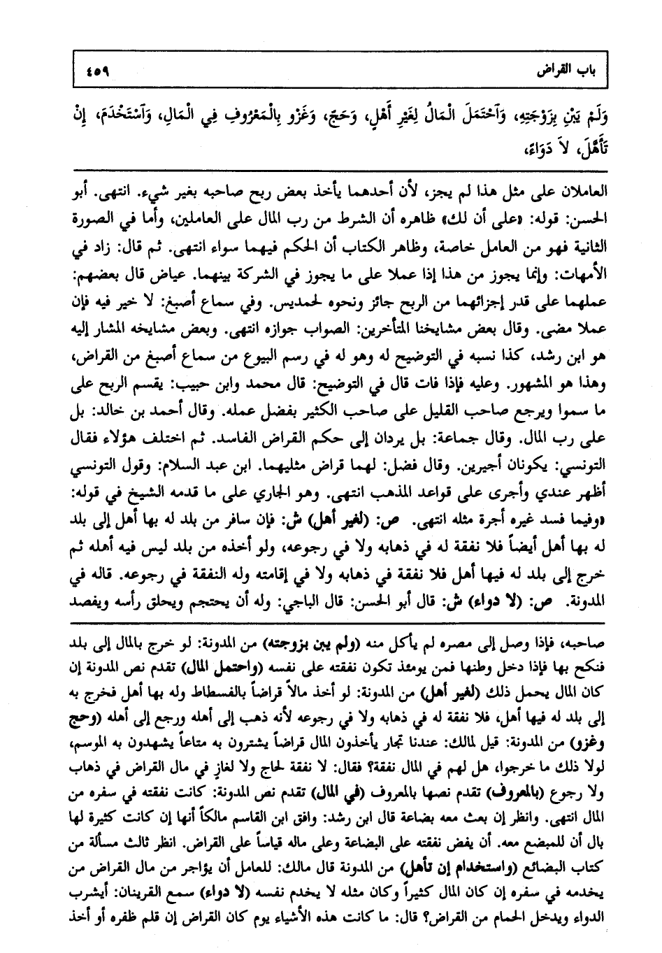 العاملان على مثل هذا لم يجز؛ لأن أحدهما يأخذ بعض ربح صاحبه بغير شيء انتهى. أبو الحسن قوله: "على أن لك" ظاهره أن الشرط من رب المال على العاملين، وأما في الصورة الثانية فهو من العامل خاصة وظاهر الكتاب: أن الحكم فيهما سواء انتهى. ثم قال: زاد في الأمهات: وإنما يجوز من هذا إذا عملا على ما يجوز في الشركة بينهما عياض قال بعضهم: عملهما على قدر أجزائهما من الربح جائز، ونحوه لحمديس وفي سماع أصبغ لا خير فيه، فإن عملا مضى، وقال بعض مشايخنا المتأخرين: الصواب: جوازه انتهى. وبعض مشايخه المشار إليه هو ابن رشد كذا نسبه في التوضيح له، وهو له في رسم البيوع من سماع أصبغ من القراض، وهذا هو المشهور وعليه، فإذا فات قال في التوضيح قال محمد وابن حبيب يقسم الربح على ما سموا ويرجع صاحب القليل على صاحب الكثير بفضل عمله، وقال أحمد بن خالد: بل على رب المال، وقال جماعة: بل يردان إلى حكم القراض الفاسد، ثم اختلف هؤلاء فقال التونسي: يكونان أجيرين، وقال فضل: لهما قراض مثليهما ابن عبد السلام وقول التونسي أظهر عندي وأجرى على قواعد المذهب انتهى. وهو الجاري على ما قدمه الشيخ في قوله، وفيما فسد غيره أجرة مثله انتهى. ص: (لغير أهل) ش: فإن سافر من بلد له بها أهل إلى بلد له بها أهل أيضا فلا نفقة له في ذهابه، ولا في رجوعه، ولو أخذه من بلد ليس فيه أهله، ثم خرج إلى بلد له فيها أهل فلا نفقة في ذهابه، ولا في إقامته، وله النفقة في رجوعه قاله في المدونة. ص: (لا دواء) ش: قال أبو الحسن قال الباجي: وله أن يحتجم ويحلق رأسه ويفصد