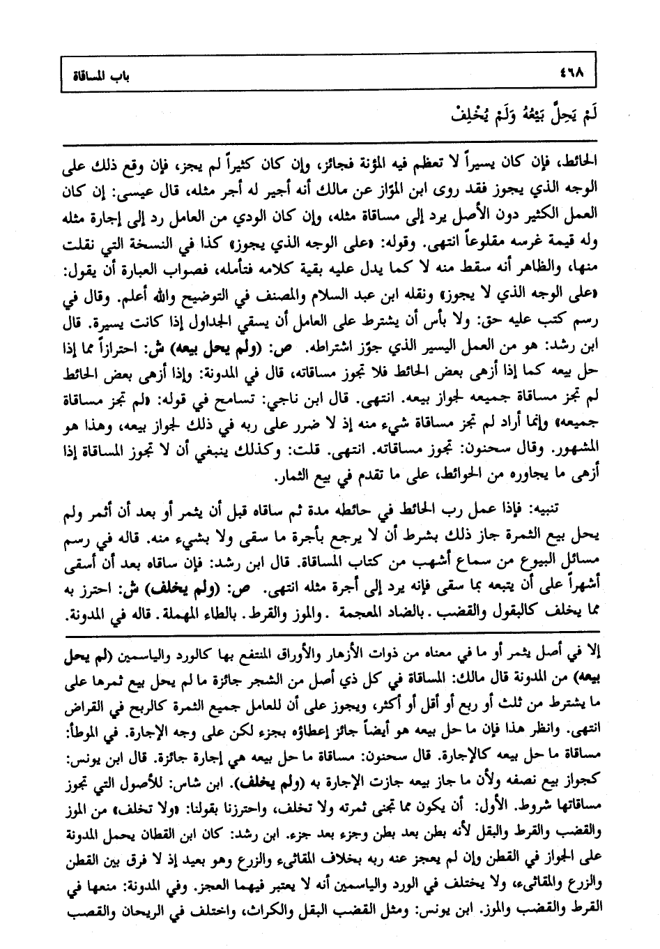 الحائط، فإن كان يسيرا لا تعظم فيه المؤنة فجائز، وإن كان كثيرا لم يجز، فإن وقع ذلك على الوجه الذي يجوز، فقد روى ابن المواز عن مالك أنه أجير له أجر مثله، قال عيسى إن كان العمل الكثير دون الأصل يرد إلى مساقاة مثله، وإن كان الودي من العامل رد إلى إجارة مثله وله قيمة غرسه مقلوعا انتهى. وقوله: "على الوجه الذي يجوز" كذا في النسخة التي نقلت منها، والظاهر: أنه سقط منه لا كما يدل عليه بقية كلامه فتأمله فصواب العبارة أن يقول: "على الوجه الذي لا يجوز" ونقله ابن عبد السلام والمصنف في التوضيح والله أعلم. وقال في رسم كتب عليه حق، ولا بأس أن يشترط على العامل أن يسقي الجداول إذا كانت يسيرة قال ابن رشد هو من العمل اليسير الذي جوزوا اشتراطه. ص: (ولم يحل بيعه) ش: احترازا مما إذا حل بيعه كما إذا أزهى بعض الحائط فلا تجوز مساقاته قال في المدونة: وإذا أزهى بعض الحائط لم تجز مساقاة جميعه لجواز بيعه انتهى. قال ابن ناجي: تسامح في قوله لم تجز مساقاة جميعه، وإنما أراد لم تجز مساقاة شيء منه إذ لا ضرر على ربه في ذلك لجواز بيعه، وهذا هو المشهور، وقال سحنون تجوز مساقاته انتهى. قلت: وكذلك ينبغي أن لا تجوز المساقاة إذا أزهى ما يجاوره من الحوائط على ما تقدم في بيع الثمار.