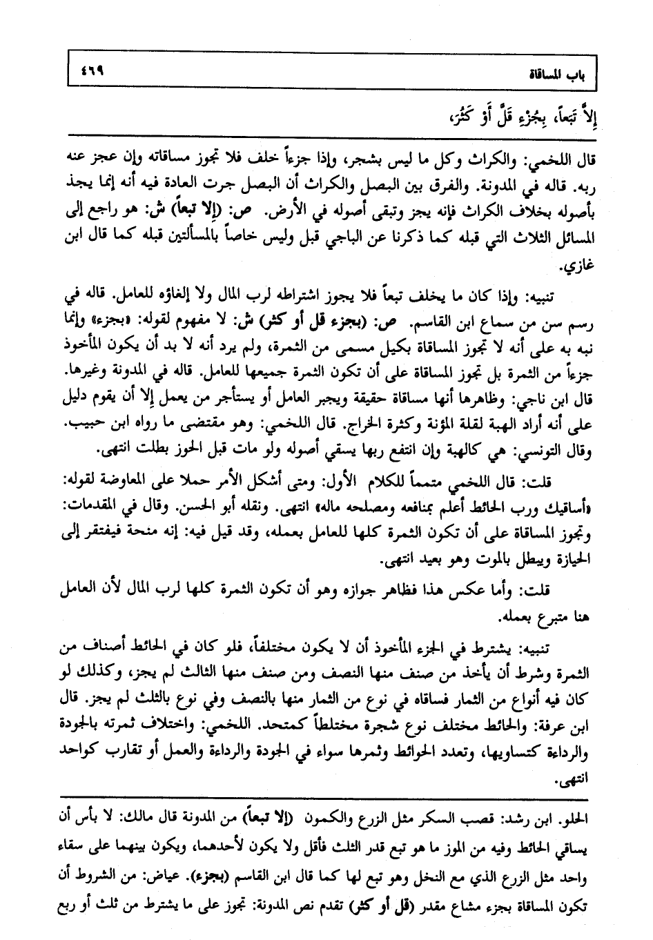 تنبيه: وإذا كان ما يخلف تبعا فلا يجوز اشتراطه لرب المال، ولا إلغاؤه للعامل قاله في رسم سن من سماع ابن القاسم. ص: (بجزء قل، أو كثر) ش: لا مفهوم لقوله بجزء، وإنما نبه به على أنه لا تجوز المساقاة بكيل مسمى من الثمرة، ولم يرد أنه لا بد أن يكون المأخوذ جزءا من الثمرة بل تجوز المساقاة على أن تكون الثمرة جميعها للعامل قاله في المدونة وغيرها قال ابن ناجي: وظاهرها أنها مساقاة حقيقية، ويجبر العامل أو يستأجر من يعمل إلا أن يقوم دليل على أنه أراد الهبة لقلة المؤنة وكثرة الخراج قال اللخمي، وهو مقتضى ما رواه ابن حبيب، وقال التونسي: هي كالهبة، وإن انتفع ربها بسقي أصوله، ولو مات قبل الحوز بطلت انتهى.