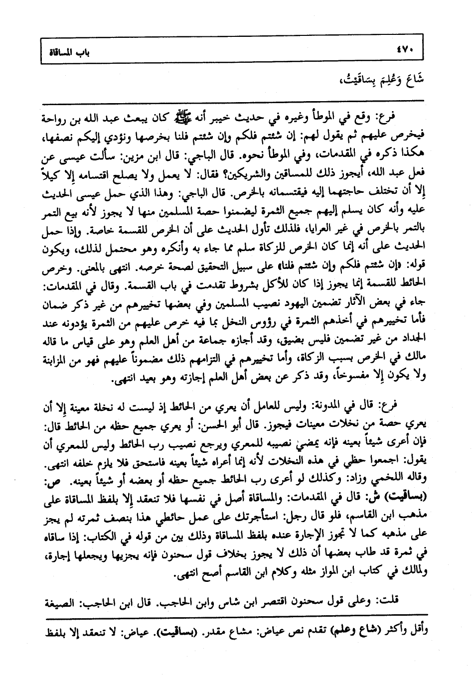 فرع: قال في المدونة: وليس للعامل أن يعري من الحائط إذ ليست له نخلة معينة إلا أن يعري حصة من نخلات معينات فيجوز قال أبو الحسن، أو يعري جميع حظه من الحائط قال، فإن أعرى شيئا بعينه فإنه يمضي نصيبه للمعرى، ويرجع نصيب رب الحائط، وليس للمعري أن يقول: اجمعوا حظي في هذه النخلات؛ لأنه إنما أعراه شيئا بعينه فاستحق فلا يلزم خلفه انتهى. وقاله اللخمي وزاد: وكذلك لو أعرى رب الحائط جميع حظه، أو بعضه، أو شيئا بعينه. ص: (بساقيت) ش: قال في المقدمات والمساقاة أصل في نفسها فلا تنعقد إلا بلفظ المساقاة على مذهب ابن القاسم فلو قال رجل استأجرتك على عمل حائطي هذا بنصف ثمرته لم يجز على مذهبه كما لا تجوز الإجارة عنده بلفظ المساقاة، وذلك بين من قوله في الكتاب: إذا ساقاه في ثمرة قد طاب بعضها أن ذلك لا يجوز بخلاف قول سحنون فإنه يجيزها ويجعلها إجارة ولمالك في كتاب ابن المواز مثله وكلام ابن القاسم أصح انتهى.
