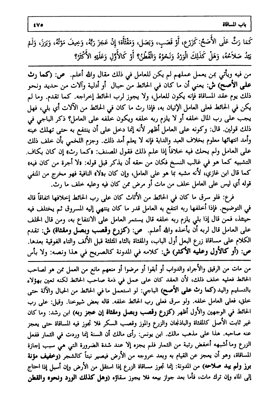 فرع: فلو سرق ما كان في الحائط من الأثاث كان على رب الحائط إخلافها اتفاقا قاله في التوضيح، فإذا أخلفها ربه انتفع به العامل قدر ما كان ينتهي إليه المسروق، ثم يختلف فيه حينئذ فمن قال إذا بلي يلزم ربه خلفه قال يستمر العامل على الانتفاع به، ومن قال الخلف على العامل قال لربه أن يأخذه، والله أعلم. ص: (كزرع وقصب وبصل ومقثأة) ش: تقدم الكلام على مساقاة زرع البعل أول الباب والمقثأة بالثاء المثلثة قبل الألف والتاء الفوقية بعدها. ص: (أو كالأول، وعليه الأكثر) ش: كلامه في المدونة كالصريح في هذا، ونصه: ولا بأس