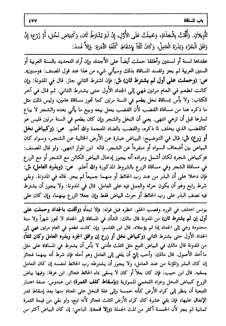 عقداها لسنة أو لسنتين وأطلقا حملت أيضا على الأجدة، وإن أراد التحديد بالسنة العربية، أو السنين العربية لم يجز وتفسد المساقاة بذلك وسيأتي شيء من هذا عند قول المصنف: "وسنين". ص: (وحملت على أول، لم يشترط ثان) ش، فإن اشترط الثاني جاز قال في المدونة: وإن كانت تطعم في العام مرتين فهي إلى الجداد الأول حتى يشترط الثاني، ثم قال في آخر الكتاب: ولا بأس بمساقاة نخل يطعم في السنة مرتين كما تجوز مساقاة عامين، وليس ذلك مثل ما ذكره هنا من مساقاة القضب؛ لأن القضب يحل بيعه وبيع ما يأتي بعده والشجر لا يباع ثمارها قبل أن تزهي انتهى. يعني أن النخل والشجر، وإن كان يطعم في السنة مرتين فليس هو كالقضب الذي يخلف لما ذكره، والقضب بالضاد المعجمة والله أعلم. ص: (وكبياض نخل، أو زرع) ش: قال في التوضيح: البياض عبارة عن الأرض الخالية عن الشجر، وسواء كان البياض بين أضعاف السواد، أو منفردا عن الشجر، قاله ابن المواز انتهى. ولو قال المصنف: "وكبياض شجر" لكان أشمل، ومراده أنه يجوز إدخال البياض الكائن مع الشجر، أو مع الزرع في مساقاة الشجر، وفي مساقاة الزرع بالشروط المذكورة، والله أعلم. ص: (وبذره العامل) ش: فإن دخلا على أن البذر من عند رب الحائط أو منهما جميعا لم يجز قاله في المدونة وبقي شرط رابع، وهو أن يكون حرثه والعمل فيه على العامل، قال في المدونة: ولا يجوز أن يشترط فيه نصف البذر على رب الحائط، أو حرث البياض فقط، وإن جعلا الزرع بينهما، وإن كان على