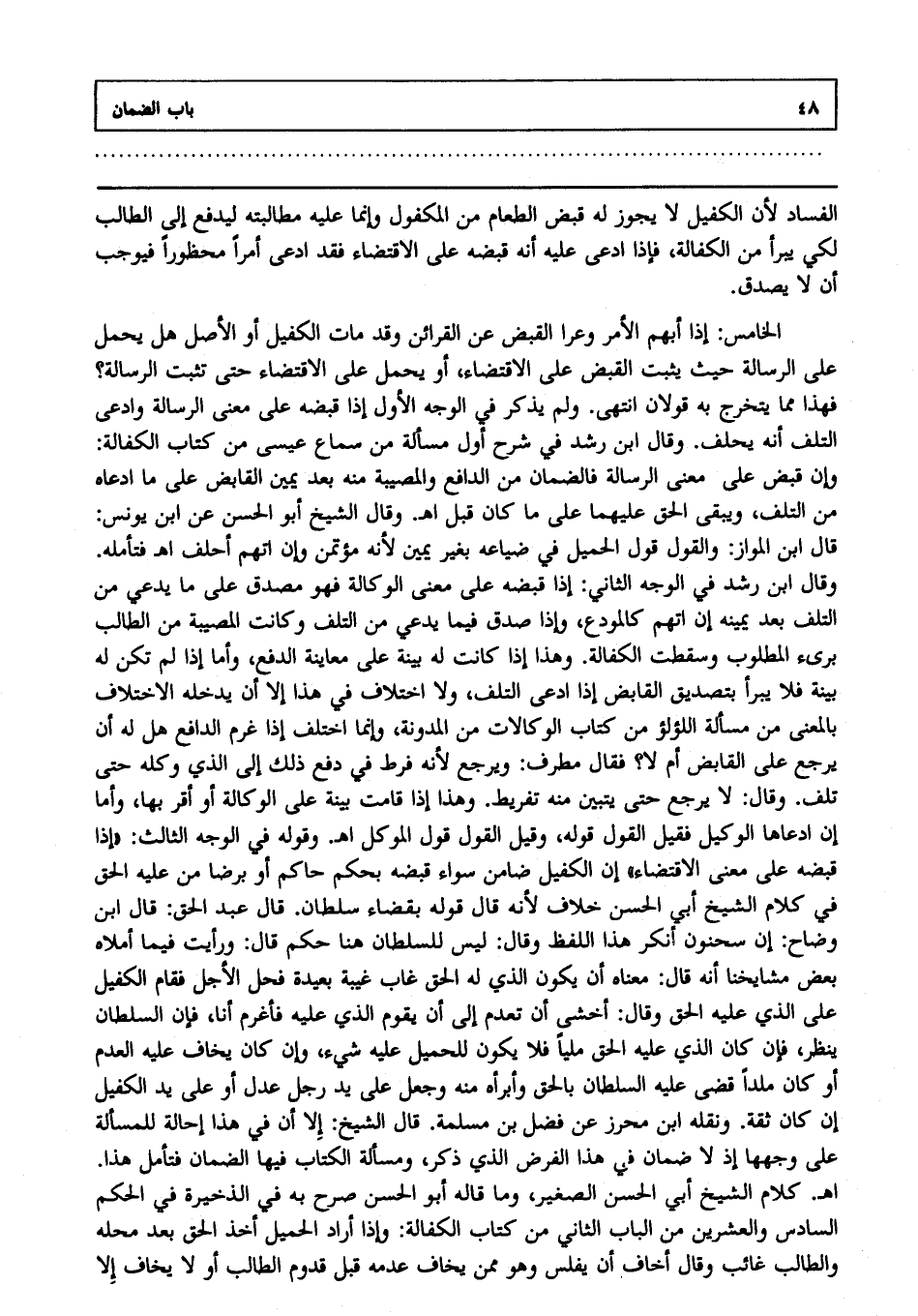 الخامس: إذا أبهم الأمر وعرا القبض عن القرائن، وقد مات الكفيل، أو الأصل هل يحمل على الرسالة حيث يثبت القبض على الاقتضاء، أو يحمل على الاقتضاء حتى تثبت الرسالة؟ فهذا مما يتخرج به قولان انتهى، ولم يذكر في الوجه الأول إذا قبضه على معنى الرسالة وادعى التلف أنه يحلف، وقال ابن رشد في شرح أول مسألة من سماع عيسى من كتاب الكفالة: وإن قبض على معنى الرسالة فالضمان من الدافع، والمصيبة منه بعد يمين القابض على ما ادعاه من التلف ويبقى الحق عليهما على ما كان قبل ا هـ. وقال الشيخ أبو الحسن عن ابن يونس: قال ابن المواز: والقول قول الحميل في ضياعه بغير يمين؛ لأنه مؤتمن، وإن اتهم أحلف ا هـ. فتأمله. وقال ابن رشد في الوجه الثاني: إذا قبضه على معنى الوكالة فهو مصدق على ما يدعي من التلف بعد يمينه إن اتهم كالمودع وإذا صدق فيما يدعي من التلف وكانت المصيبة من الطالب برئ المطلوب وسقطت الكفالة، وهذا إذا كانت له بينة على معاينة الدفع، وأما إذا لم تكن له بينة فلا يبرأ بتصديق القابض إذا ادعى التلف، ولا اختلاف في هذا إلا أن يدخله الاختلاف بالمعنى من مسألة اللؤلؤ من كتاب الوكالات من المدونة. وإنما اختلف إذا غرم الدافع هل له أن يرجع على القابض أم لا؟ فقال مطرف: ويرجع؛ لأنه فرط في دفع ذلك إلى الذي وكله حتى تلف، وقال لا يرجع حتى يتبين منه تفريط، وهذا إذا قامت بينة على الوكالة، أو أقر بها وأما إن ادعاها الوكيل فقيل: القول قوله وقيل: القول قول الموكل ا هـ. وقوله في الوجه الثالث: إذا قبضه على معنى الاقتضاء إن الكفيل ضامن سواء قبضه بحكم حاكم، أو برضا من عليه الحق في كلام الشيخ أبي الحسن خلاف؛ لأنه قال قوله بقضاء سلطان قال عبد الحق: قال ابن وضاح: إن سحنونا أنكر هذا اللفظ، وقال: ليس للسلطان هنا حكم قال: ورأيت فيما أملاه بعض مشايخنا أنه قال معناه أن يكون الذي له الحق غاب غيبة بعيدة فحل الأجل فقام الكفيل على الذي عليه الحق، وقال: أخشى أن تعدم إلى أن يقوم الذي عليه، فأغرم أنا فإن السلطان ينظر فإن كان الذي عليه الحق مليا فلا يكون للحميل عليه شيء، وإن كان يخاف عليه العدم، أو كان ملدا قضى عليه السلطان بالحق وأبرأه منه وجعل على يد رجل عدل، أو على يد الكفيل إن كان ثقة، ونقله ابن محرز عن فضل بن مسلمة قال الشيخ إلا أن في هذا إحالة للمسألة على وجهها إذ لا ضمان في هذا الفرض الذي ذكر. ومسألة الكتاب فيها الضمان فتأمل هذا ا هـ كلام الشيخ أبي الحسن الصغير وما قاله أبو الحسن صرح به في الذخيرة في الحكم السادس والعشرين من الباب الثاني من كتاب الكفالة، وإذا أراد الحميل أخذ الحق بعد محله، والطالب غائب، وقال أخاف أن يفلس وهو ممن يخاف عدمه قبل قدوم الطالب، أو لا يخاف إلا