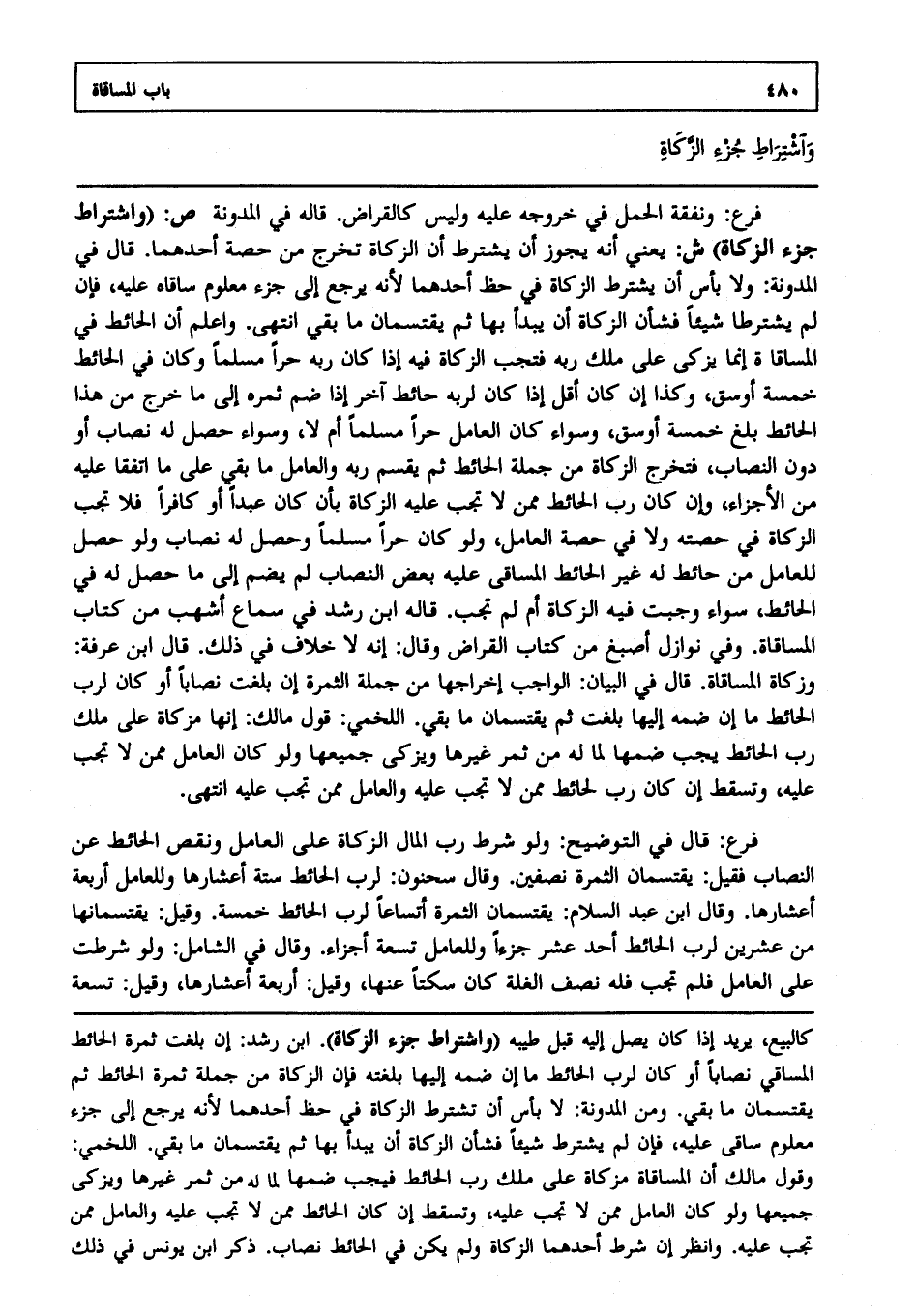 فرع: قال في التوضيح: ولو شرط رب المال الزكاة على العامل ونقص الحائط عن النصاب فقيل: يقتسمان الثمرة نصفين، وقال سحنون: لرب الحائط ستة أعشارها، وللعامل أربعة أعشارها، وقال ابن عبد السلام: يقتسمان الثمرة أتساعا لرب الحائط خمسة، وقيل: يقتسمانها من عشرين لرب الحائط أحد عشر جزءا وللعامل تسعة أجزاء، وقال في الشامل: ولو شرطت على العامل، فلم تجب فله نصف الغلة كأن سكتا عنها، وقيل: أربعة أعشارها، وقيل: تسعة
