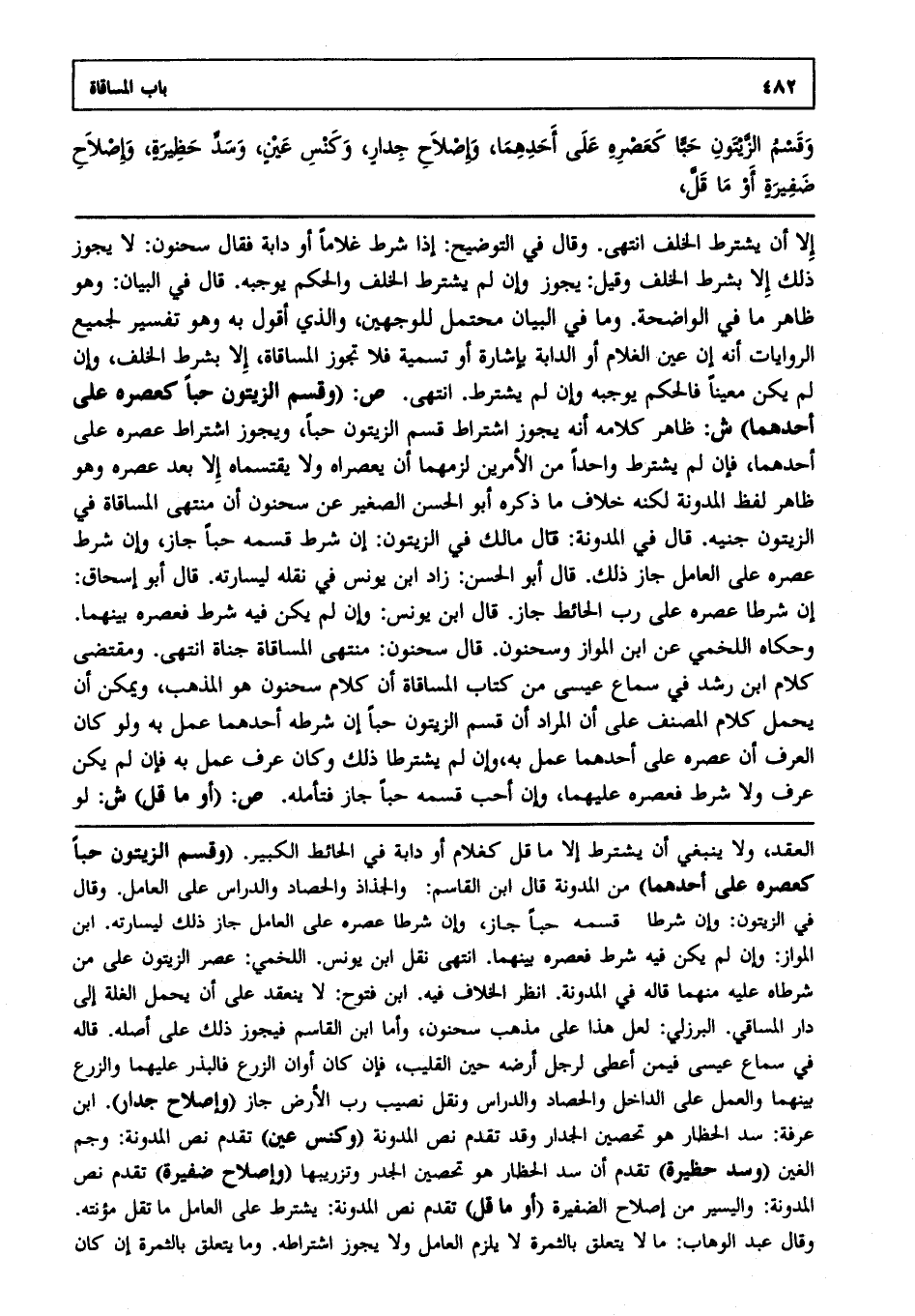 وقسم الزيتون حبا كعصره على أحدهما، وإصلاح جدار، وكنس عين، وسد حظيرة، وإصلاح ضفيرة أو ما قل،
