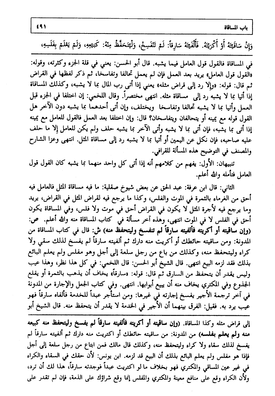 الثاني: قال ابن عرفة عبد الحق عن بعض شيوخ صقلية: ما فيه مساقاة المثل، فالعامل فيه أحق من الغرماء بالثمرة في الموت والفلس، وكذا ما يرجع فيه لقراض المثل في القراض يريد، وما يرجع فيه لأجرة المثل لا يكون في القراض أحق في موت، ولا فلس، وفي المساقاة يكون أحق في الفلس لا في الموت انتهى. وهذه آخر مسألة في كتاب المساقاة منه والله أعلم. ص: (وإن ساقيته، أو أكريته، فألفيته سارقا لم تنفسخ، وليتحفظ منه) ش: قال في كتاب المساقاة من المدونة: ومن ساقيته حائطك، أو أكريت منه دارك، ثم ألفيته سارقا لم يفسخ لذلك سقي، ولا كراء وليتحفظ منه، وكذلك من باع من رجل سلعة إلى أجل، وهو مفلس، ولم يعلم البائع بذلك، فقد لزمه البيع انتهى. قال الشيخ أبو الحسن قال اللخمي: في كل هذا نظر، وهذا عيب، وليس يقدر أن يتحفظ من السارق، ثم قال قوله: "سارقا" يخاف أن يذهب بالثمرة، أو يقلع الجذوع، وفي المكتري يخاف منه أن يبيع أبوابها انتهى. وفي كتاب الجعل والإجارة من المدونة في آخر ترجمة الأجير يفسخ إجارته في غيرها، ومن استأجر عبدا للخدمة، فألفاه سارقا، فهو عيب يرد به، فقيل: الفرق بينهما أن الأجير في الخدمة لا يقدر أن يتحفظ منه، قال الشيخ أبو