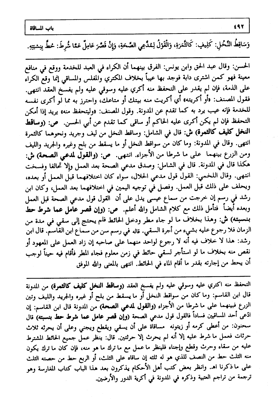 الحسن: وقال عبد الحق وابن يونس: الفرق بينهما أن الكراء في العبد للخدمة ووقع في منافع معينة، فهو كمن اشترى دابة، فوجد بها عيبا بخلاف المكتري والمفلس والمساقي إنما وقع الكراء على الذمة، فإن لم يقدر على التحفظ منه أكرى عليه وسوقي عليه، ولم يفسخ العقد انتهى. فقول المصنف: "أو أكريته" أي أكريت منه بيتك، أو متاعك، واحترز به مما لو أكرى نفسه للخدمة، فإنه عيب يرد به كما تقدم عن المدونة وقول المصنف: "وليتحفظ منه" يريد إذا أمكن التحفظ، فإن لم يمكن أكرى عليه الحاكم، أو ساقى كما تقدم عن أبي الحسن. ص: (وساقط النخل كليف كالثمرة) ش: قال في الشامل وساقط النخل من ليف وجريد ونحوهما كالثمرة انتهى. وقال في المدونة: وما كان من سواقط النخل، أو ما يسقط من بلح وغيره والجريد والليف ومن الزرع بينهما على ما شرطا من الأجزاء انتهى. ص: (والقول لمدعي الصحة) ش: هكذا قال في المدونة قال في الشامل: وصدق مدعي الصحة بعد العمل، وإلا تحالفا وفسخت انتهى. وقال اللخمي: القول قول مدعي الحلال سواء كان اختلافهما قبل العمل، أو بعده ويحلف على ذلك قبل العمل وفصل في توجيه اليمين في اختلافهما بعد العمل، وكلام ابن رشد في رسم إن خرجت من سماع عيسى يدل على أن القول قول مدعي الصحة قبل العمل وبعده أيضا، فتأمل ذلك مع كلام الشامل، والله أعلم. ص: (وإن قصر عامل عما شرط حط بنسبته) ش: وهذا بخلاف ما لو جاء مطر ودخل الحائط، فلم يحتج إلى سقي في مدة من الزمان، فلا رجوع عليه بشيء من أجرة السقي قاله في رسم سن من سماع ابن القاسم، قال ابن رشد هذا لا خلاف فيه أنه لا رجوع لواحد منهما على صاحبه إن زاد العمل على المعهود، أو نقص منه بخلاف ما لو استأجر لسقي حائط في زمن معلوم، فجاء المطر، فأقام فيه حينا لوجب أن يحط من إجارته بقدر ما أقام الماء في الحائط انتهى بالمعنى والله الموفق