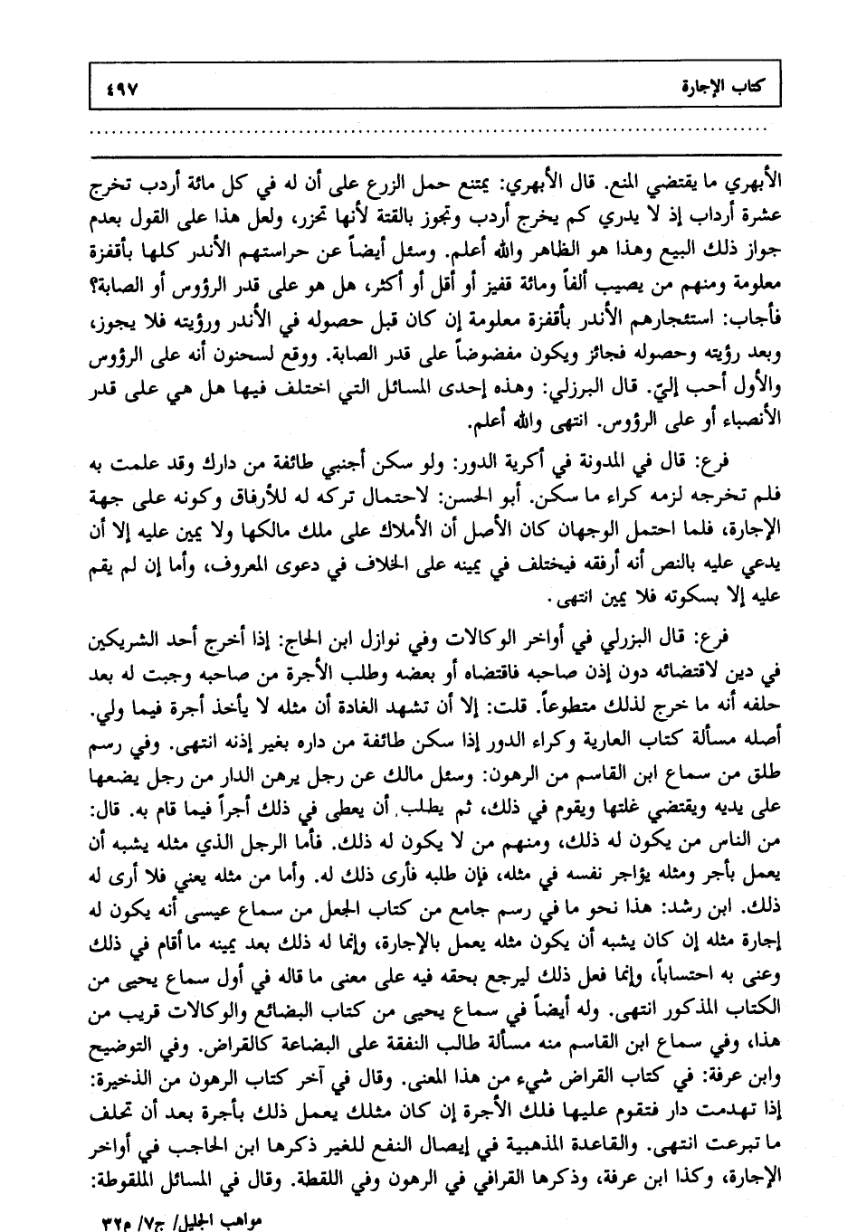 الأبهري ما يقتضي المنع قال الأبهري يمتنع حمل الزرع على أن له في كل مائة إردب تخرج عشرة أرادب؛ إذ لا يدري كم إردبا يخرج؟ وتجوز بالقتة؛ لأنها تحزر، ولعل هذا على القول بعدم جواز ذلك البيع، وهذا هو الظاهر والله أعلم. وسئل أيضا عن حراستهم الأندر كلها بأقفزة معلومة، ومنهم من يصيب ألفا ومائة قفيز، أو أقل أو أكثر هل هو على قدر الرءوس أو الصابة؟ فأجاب: استئجارهم الأندر بأقفزة معلومة إن كان قبل حصوله في الأندر ورؤيته، فلا يجوز وبعد رؤيته وحصوله، فجائز، ويكون مفضوضا على قدر الصابة، ووقع لسحنون أنه على الرءوس والأول: أحب إلي قال البرزلي: وهذه إحدى المسائل التي اختلف فيها، هل هي على قدر الأنصباء، أو على الرءوس؟ انتهى. والله أعلم.