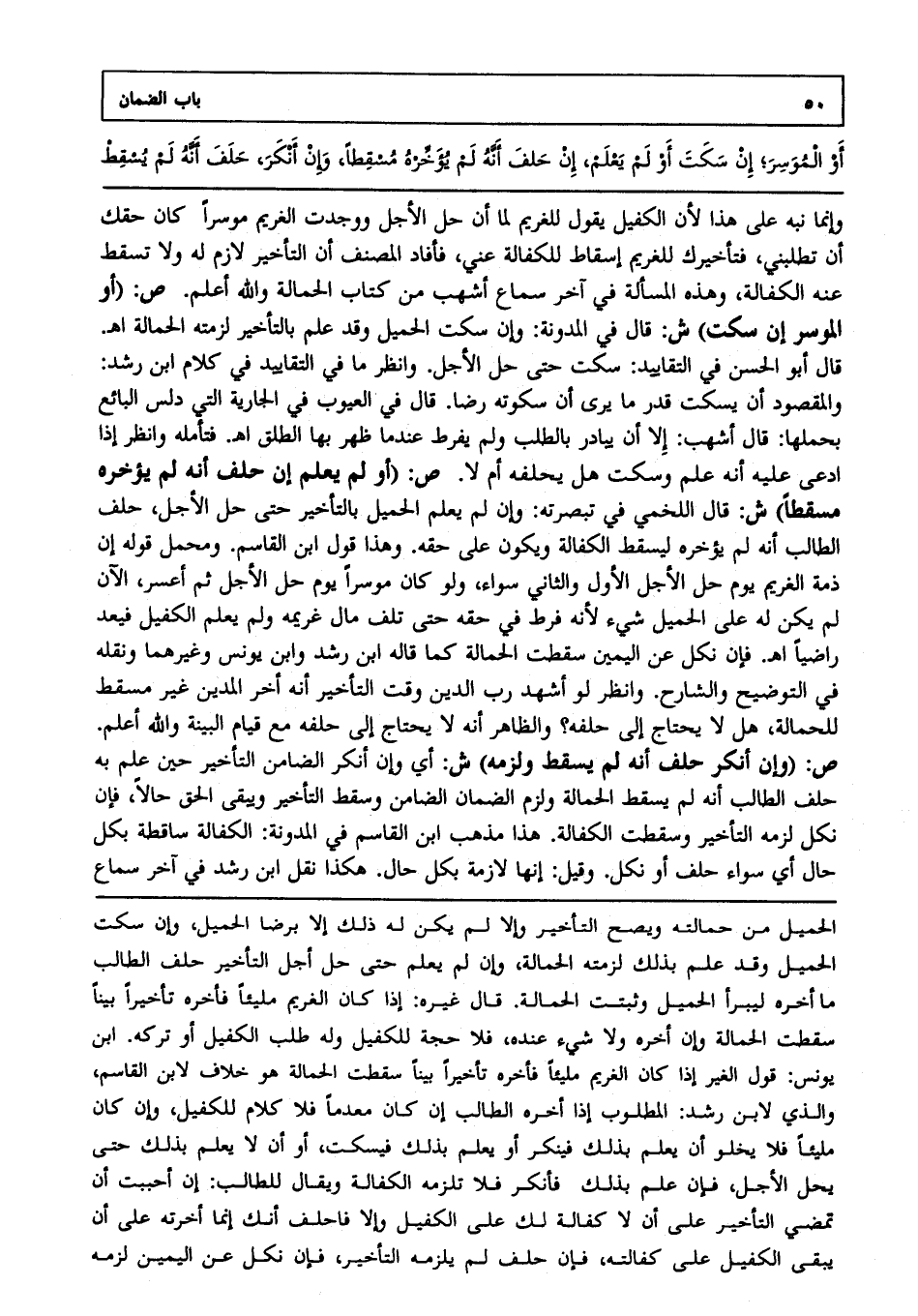 وإنما نبه على هذا؛ لأن الكفيل يقول للغريم: لما أن حل الأجل ووجدت الغريم موسرا كان حقك أن تطلبني فتأخيرك للغريم إسقاط للكفالة عني فأفاد المصنف أن التأخير لازم له ولا تسقط عنه الكفالة وهذه المسألة في آخر سماع أشهب من كتاب الحمالة والله أعلم. ص: (أو الموسر إن سكت) ش: قال في المدونة: وإن سكت الحميل، وقد علم بالتأخير لزمته الحمالة ا هـ. قال أبو الحسن في التقاييد سكت حتى حل الأجل، وانظر ما في التقاييد في كلام ابن رشد، والمقصود أن يسكت قدر ما يرى أن سكوته رضا قال في العيوب في الجارية التي دلس البائع بحملها قال أشهب إلا أن يبادر بالطلب ولم يفرط عندما ظهر بها الطلق ا هـ. فتأمله، وانظر إذا ادعى عليه أنه علم وسكت هل يحلفه أم لا. ص: (أو لم يعلم إن حلف أنه لم يؤخره مسقطا) ش: قال اللخمي في تبصرته: وإن لم يعلم الحميل بالتأخير حتى حل الأجل حلف الطالب أنه لم يؤخره ليسقط الكفالة ويكون على حقه، وهذا قول ابن القاسم ومحمل قوله أن ذمة الغريم يوم حل الأجل الأول والثاني سواء ولو كان موسرا يوم حل الأجل ثم أعسر الآن لم يكن له على الحميل شيء؛ لأنه فرط في حقه حتى تلف مال غريمه ولم يعلم الكفيل فيعد راضيا ا هـ. فإن نكل عن اليمين سقطت الحمالة كما قاله ابن رشد وابن يونس وغيرهما، ونقله في التوضيح والشارح، وانظر لو أشهد رب الدين وقت التأخير أنه أخر المدين غير مسقط للحمالة هل لا يحتاج إلى حلفه والظاهر أنه لا يحتاج إلى حلفه مع قيام البينة والله أعلم. ص: (وإن أنكر حلف أنه لم يسقط ولزمه) ش: أي، وإن أنكر الضامن التأخير حين علم به حلف الطالب أنه لم يسقط الحمالة ولزم الضمان الضامن وسقط التأخير ويبقى الحق حالا فإن نكل لزمه التأخير وسقطت الكفالة هذا مذهب ابن القاسم في المدونة الكفالة ساقطة بكل حال أي سواء حلف، أو نكل وقيل: إنها لازمة بكل حال هكذا نقل ابن رشد في آخر سماع