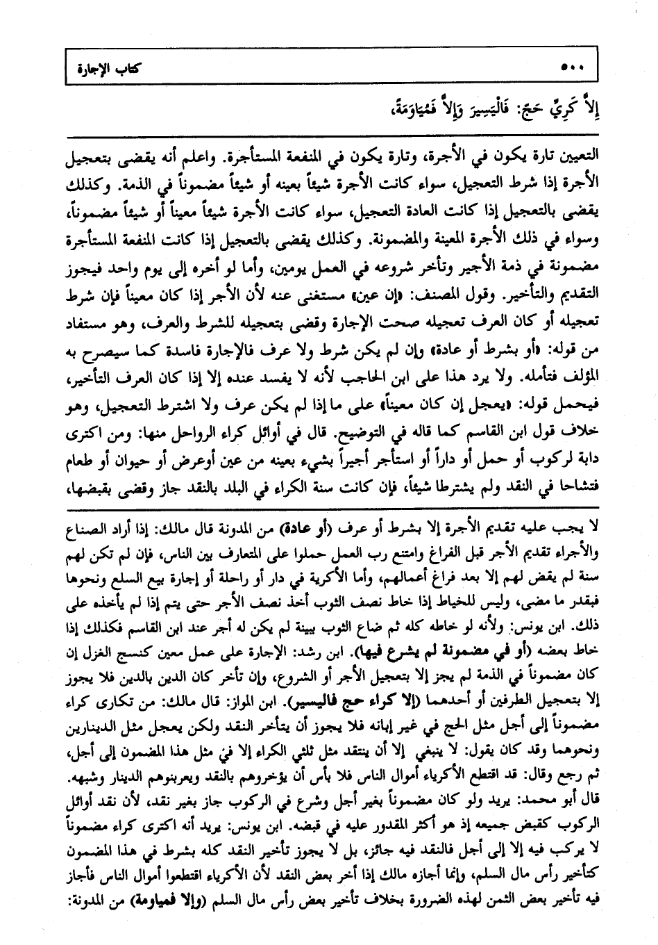 التعيين تارة يكون في الأجرة وتارة يكون في المنفعة المستأجرة، واعلم أنه يقضى بتعجيل الأجرة إذا شرط التعجيل سواء كانت الأجرة شيئا بعينه، أو شيئا مضمونا في الذمة، وكذلك يقضى بالتعجيل إذا كانت العادة التعجيل سواء كانت الأجرة شيئا معينا أو شيئا مضمونا، وسواء في ذلك الأجرة المعينة، والمضمونة، وكذلك يقضى بالتعجيل إذا كانت المنفعة المستأجرة مضمونة في ذمة الأجير وتأخر شروعه في العمل يومين، وأما لو أخره إلى يوم واحد فيجوز التقديم والتأخير وقول المصنف: "إن عين" مستغنى عنه؛ لأن الأجر إذا كان معينا، فإن شرط تعجيله، أو كان العرف تعجيله صحت الإجارة وقضي بتعجيله للشرط والعرف، وهو مستفاد من قوله: "أو بشرط أو عادة" وإن لم يكن شرط، ولا عرف فالإجارة فاسدة كما سيصرح به المؤلف فتأمله، ولا يرد هذا على ابن الحاجب؛ لأنه لا يفسد عنده إلا إذا كان العرف التأخير فيحمل قوله: "يعجل إن كان معيناً" على ما إذا لم يكن عرف، ولا اشترط التعجيل، وهو خلاف قول ابن القاسم كما قاله في التوضيح قال في أوائل كراء الرواحل منها: ومن اكترى دابة لركوب أو حمل، أو دارا، أو استأجر أجيرا بشيء بعينه من عين، أو عرض، أو حيوان، أو طعام فتشاحا في النقد، ولم يشترطا شيئا، فإن كانت سنة الكراء في البلد بالنقد جاز وقضي بقبضها،