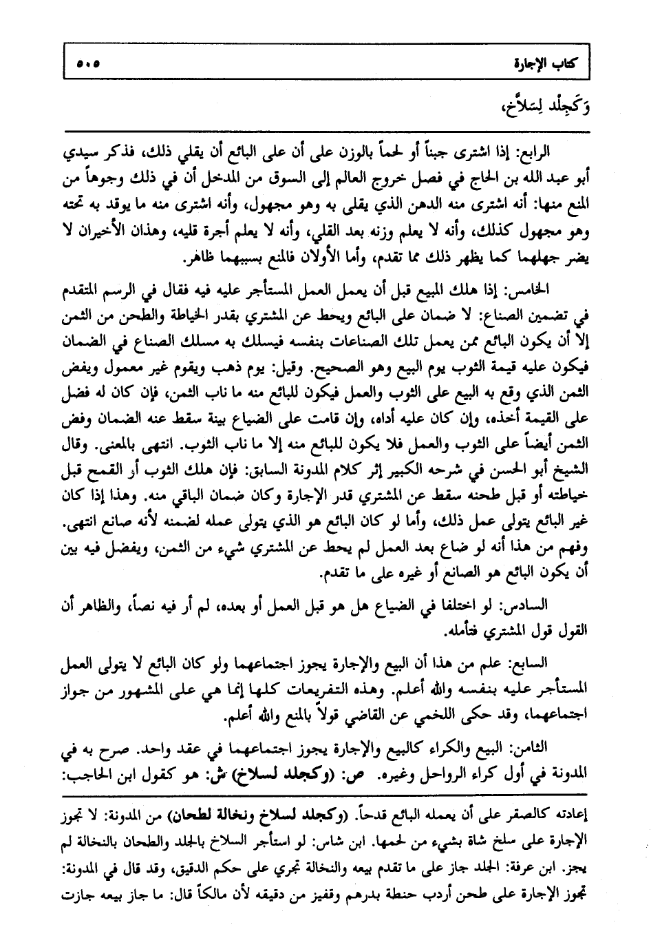 الثّامن: البيع والكراء كالبيع والإجارة يجوز اجتماعهما في عقد واحد صرّح به في المدوّنة في أوّل كراء الرّواحل وغيره. ص: (وكجلد لسلاخ) ش: هو كقول ابن الحاجب: