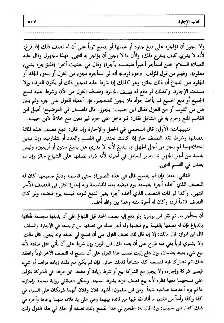 تنبيهات: الأول: قال اللخمي في الجعل والإجارة: وإن قال ادبغ نصف هذه المائة بنصفها وشرطا نقد النصف جاز إذا كانت تعتدل في القسم والعدد، أو تتقارب، وإن تباين اختلافهما لم يجز من أجل الجهل بما يدبغ؛ لأنه لا يدري هل يدبغ ستين، أو أربعين، وليس يفسد من أجل الجهل بما يصير للعامل في أجرته؛ لأن شراء نصفها على الشياع جائز، وإن لم يعتدل في القسم انتهى.