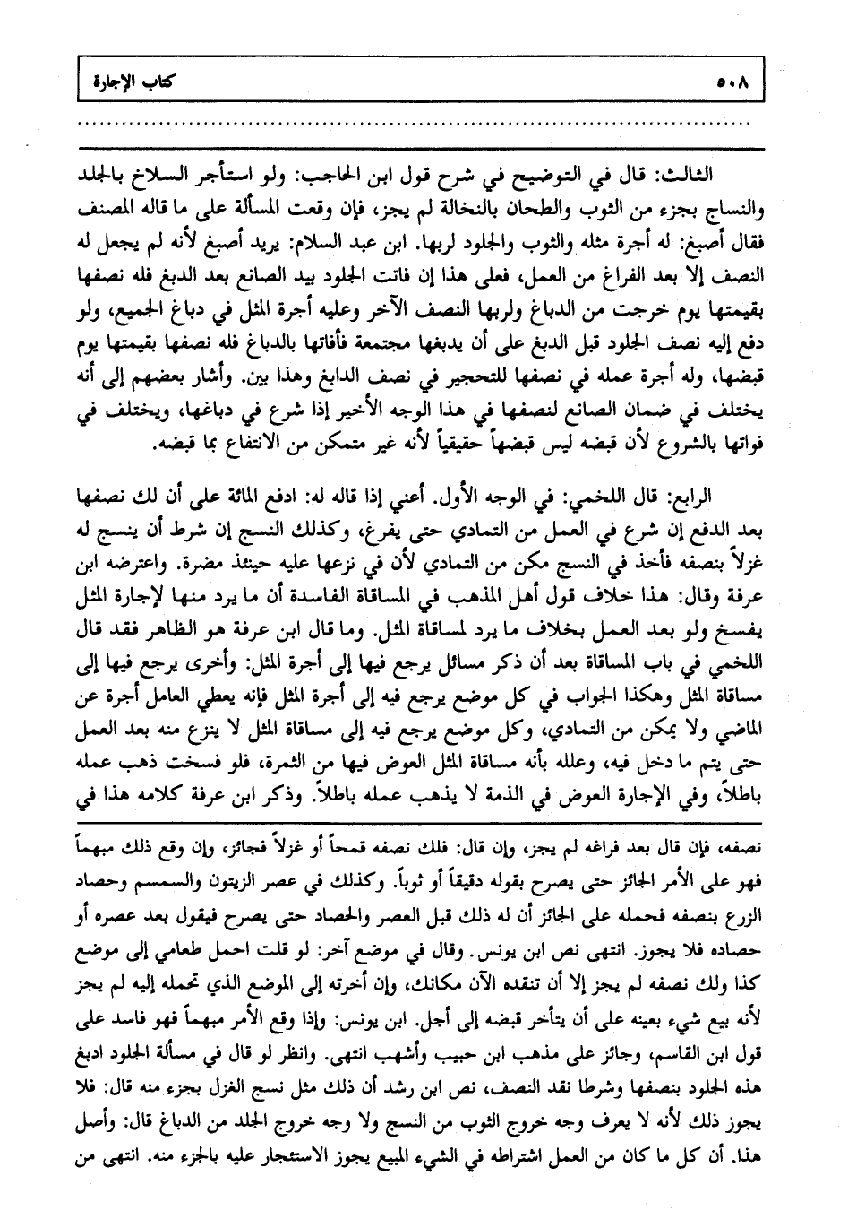 الثالث: قال في التوضيح في شرح قول ابن الحاجب: ولو استأجر السلاخ بالجلد والنساج بجزء من الثوب والطحان بالنخالة لم يجز، فإن وقعت المسألة على ما قاله المصنف فقال أصبغ: له أجرة مثله، والثوب والجلود لربها ابن عبد السلام يريد أصبغ؛ لأنه لم يجعل له النصف إلا بعد الفراغ من العمل فعلى هذا إن فاتت الجلود بيد الصانع بعد الدبغ فله نصفها بقيمتها يوم خرجت من الدباغ، ولربها النصف الآخر، وعليه أجرة المثل في دباغ الجميع، ولو دفع إليه نصف الجلود قبل الدبغ على أن يدبغها مجتمعة فأفاتها بالدباغ فله نصفها بقيمتها يوم قبضها، وله أجرة عمله في نصفها للتحجير في نصف الدابغ، وهذا بين، وأشار بعضهم إلى أنه يختلف في ضمان الصانع لنصفها في هذا الوجه الأخير إذا شرع في دباغها، ويختلف في فواتها بالشروع؛ لأن قبضه ليس قبضا حقيقيا؛ لأنه غير متمكن من الانتفاع بما قبضه.