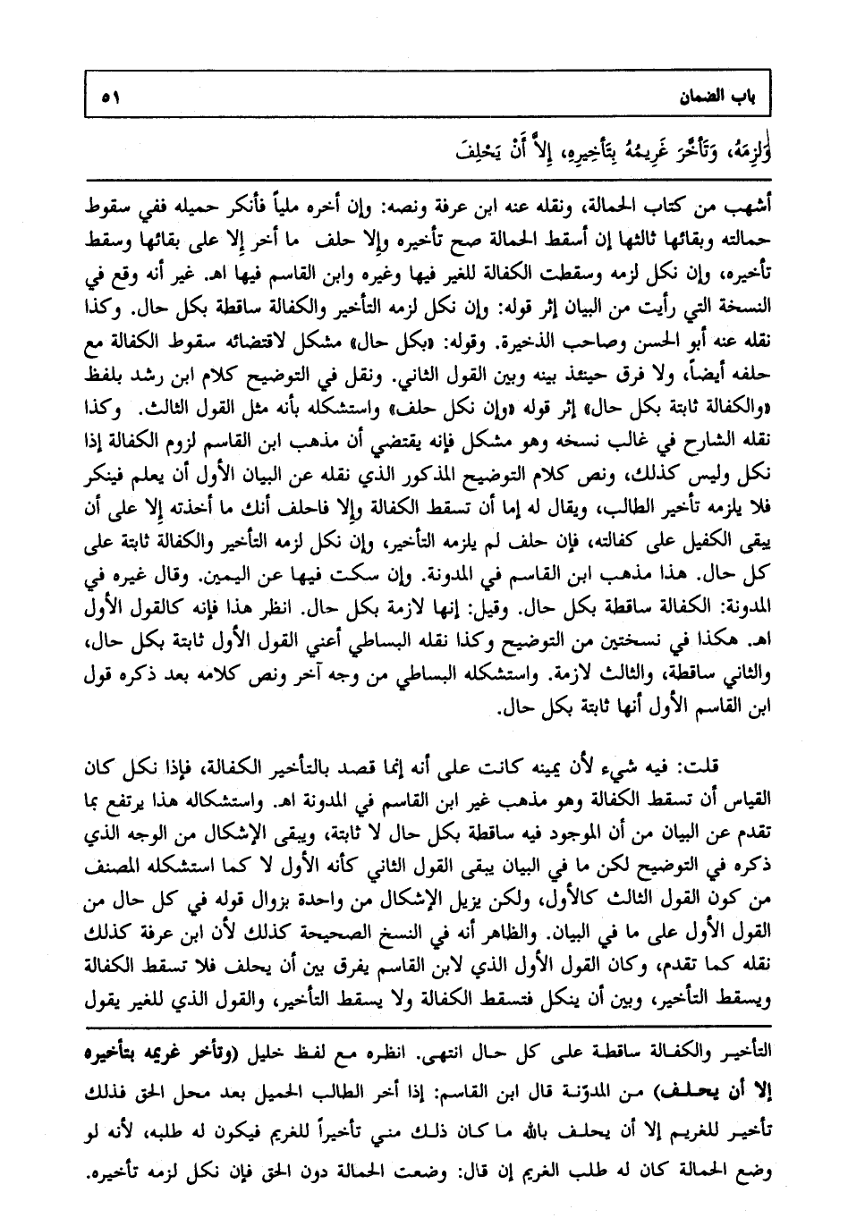أشهب من كتاب الحمالة ونقله عنه ابن عرفة ونصه: وإن أخره مليا فأنكر حميله ففي سقوط حمالته وبقائها. ثالثها إن أسقط الحمالة صح تأخيره وإلا حلف ما أخر إلا على بقائها وسقط تأخيره، وإن نكل لزمه وسقطت الكفالة للغير فيها وغيره وابن القاسم فيها ا هـ. غير أنه وقع في النسخة التي رأيت من البيان إثر قوله، وإن نكل لزمه التأخير والكفالة ساقطة بكل حال وكذا نقله عنه أبو الحسن وصاحب الذخيرة وقوله: "بكل حال" مشكل لاقتضائه سقوط الكفالة مع حلفه أيضا ولا فرق حينئذ بينه وبين القول الثاني. ونقل في التوضيح كلام ابن رشد بلفظ "والكفالة ثابتة بكل حال" إثر قوله، "وإن نكل حلف" واستشكله بأنه مثل القول الثالث. وكذا نقله الشارح في غالب نسخه وهو مشكل فإنه يقتضي أن مذهب ابن القاسم لزوم الكفالة إذا نكل وليس كذلك ونص كلام التوضيح المذكور الذي نقله عن البيان الأول أن يعلم فينكر فلا يلزمه تأخير الطالب ويقال له: إما أن تسقط الكفالة وإلا فاحلف أنك ما أخذته إلا على أن يبقى الكفيل على كفالته فإن حلف لم يلزمه التأخير، وإن نكل لزمه التأخير والكفالة ثابتة على كل حال هذا مذهب ابن القاسم في المدونة، وإن سكت فيها عن اليمين، وقال غيره في المدونة الكفالة ساقطة بكل حال وقيل: إنها لازمة بكل حال انظر هذا فإنه كالقول الأول ا هـ. هكذا في نسختين من التوضيح وكذا نقله البساطي أعني القول الأول ثابتة بكل حال، والثاني ساقطة، والثالث لازمة واستشكله البساطي من وجه آخر ونص كلامه بعد ذكره قول ابن القاسم الأول أنها ثابتة بكل حال