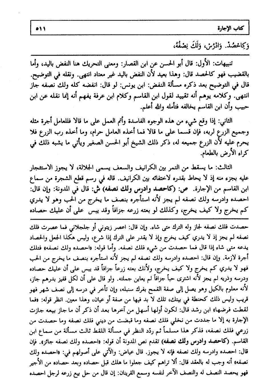 الثالث: ما يسقط من التمر بين الكرانيف والسعف يسمى الجلالة لا يجوز الاستئجار عليه بجزء منه؛ إذ لا يحاط بقدره لاختفائه بين الكرانيف قاله في رسم قطع الشجرة من سماع ابن القاسم من الإجارة. ص: (كاحصد وادرس ولك نصفه) ش: قال في المدونة: وإن قال احصده وادرسه، ولك نصفه لم يجز؛ لأنه استأجره بنصف ما يخرج من الحب، وهو لا يدري كم يخرج، ولا كيف يخرج؟ وكذلك لو بعته زرعه جزافا، وقد يبس على أن عليك حصاده