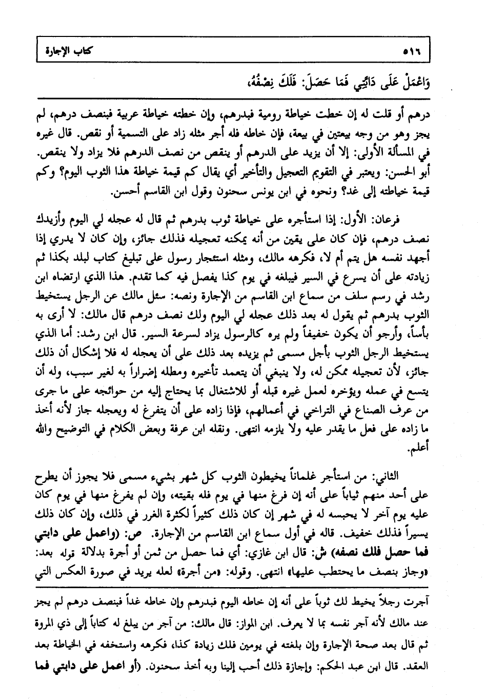 الثاني: من استأجر غلمانا يخيطون الثوب كل شهر بشيء مسمى فلا يجوز أن يطرح على أحد منهم ثيابا على أنه إن فرغ منها في يوم فله بقيته، وإن لم يفرغ منها في يوم كان عليه يوم آخر لا يحبسه له في شهر إن كان ذلك كثيرا لكثرة الغرر في ذلك، وإن كان ذلك يسيرا فذلك خفيف قاله في أول سماع ابن القاسم من الإجارة. ص: (واعمل على دابتي فما حصل فلك نصفه) ش: قال ابن غازي أي فما حصل من ثمن، أو أجرة بدلالة قوله بعد: "وجاز بنصف ما يحتطب عليها" انتهى. وقوله: "من أجرة" لعله يريد في صورة العكس التي