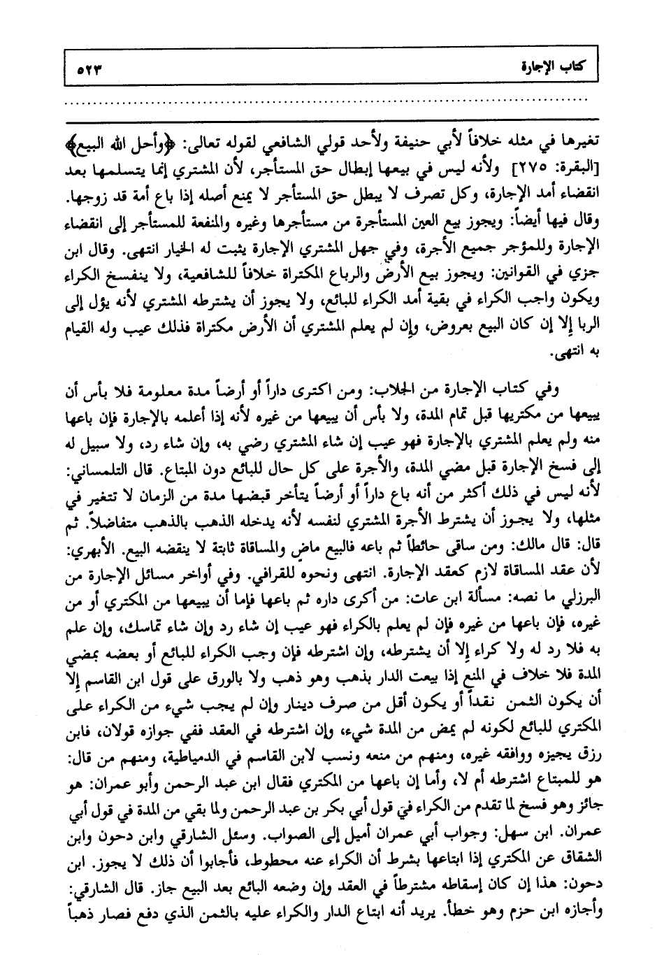 تغيرها في مثله خلافا لأبي حنيفة ولأحد قولي الشافعي لقوله تعالى: {وَأَحَلَّ اللَّهُ الْبَيْعَ} [البقرة: 275] ولأنه ليس في بيعها إبطال حق المستأجر؛ لأن المشتري إنما يتسلمها بعد انقضاء أمد الإجارة، وكل تصرف لا يبطل حق المستأجر لا يمنع أصله إذا باع أمة قد زوجها، وقال فيها أيضا: ويجوز بيع العين المستأجرة من مستأجرها وغيره، والمنفعة للمستأجر إلى انقضاء الإجارة وللمؤجر جميع الأجرة، وفي جهل المشتري الإجارة يثبت له الخيار انتهى. وقال ابن جزي في القوانين، ويجوز بيع الأرض والرباع المكتراة خلافا للشافعية، ولا ينفسخ الكراء، ويكون واجب الكراء في بقية أمد الكراء للبائع، ولا يجوز أن يشترطه المشتري؛ لأنه يئول إلى الربا إلا إن كان البيع بعروض، وإن لم يعلم المشتري أن الأرض مكتراة فذلك عيب، وله القيام به انتهى.