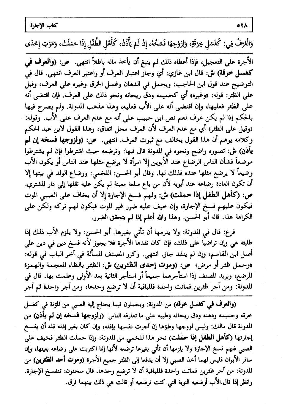 الأجرة على التعجيل، فإذا أعطاه ذلك لم ينبغ أن يأخذ ماله باطلا انتهى. ص: (والعرف في كغسل خرقة) ش: قال ابن غازي: أي وجاز اعتبار العرف، أو واعتبر العرف انتهى. قال في التوضيح عند قول ابن الحاجب ويحمل في الدهان وغسل الخرق وغيره على العرف، وقيل: على الظئر قوله: "وغيره" أي كحميمه ودق ريحانه ونحو ذلك على العرف، فإن اقتضى أنه على الظئر، فعليها، وإن اقتضى أنه على الأب، فعليه، وهذا مذهب المدونة، ولم يصرح فيها بالحكم إذا لم يكن عرف نعم نص ابن حبيب على أنه مع عدم العرف على الأب وقوله: "وقيل على الظئر" أي مع عدم العرف؛ لأن العرف محل اتفاق، وهذا القول لابن عبد الحكم وكلامه يوهم أن هذا القول يخالف مع ثبوت العرف انتهى. ص: (ولزوجها فسخه إن لم يأذن) ش: تصوره واضح، ونحوه في المدونة قال فيها: وترضعه حيث اشترطوا، فإن لم يشترطوا موضعا فشأن الناس الرضاع عند الأبوين إلا امرأة لا يرضع مثلها عند الناس، أو يكون الأب وضيعا لا يرضع مثلها عنده، فذلك لها، وقال أبو الحسن اللخمي: ورضاع الولد في بيتها إلا أن تكون العادة رضاعه عند أبويه؛ لأن من باع سلعة معينة لم يكن عليه نقلها إلى دار المشتري. ص: (كأهل الطفل إذا حملت) ش: ولهم فسخ الإجارة إلا أن يخاف على الصبي الموت، فيكون عليهم فسخ الإجارة، وإن خيف عليه ضرر غير الموت، فيكون لهم تركه، ولكن على الكراهة هذا قاله أبو الحسن، وهذا والله أعلم إذا لم يتحقق الضرر.