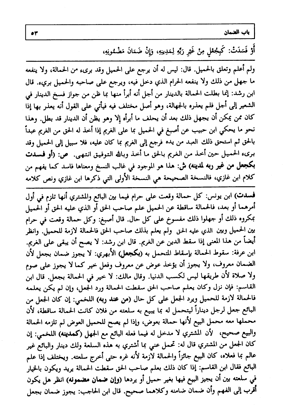 ولم أعلم وتعلق بالحميل. قال: ليس له أن يرجع على الحميل، وقد برئ من الحمالة ولا ينفعه ما جهل من ذلك ولا ينفعه الحرام الذي دخل فيه ويرجع على صاحبه والحميل بريء قال ابن رشد: إنما بطلت الحمالة بالدّينار من أجل أنه أبرأ منها بما ظن من جواز فسخ الدّينار في الشعير إلى أجل فلم يعذره بالجهالة وهو أصل مختلف فيه فيأتي على القول أنه يعذر بها إذا كان ممن يمكن أن يجهل ذلك بعد أن يحلف ما أبرأه إلا وهو يظنّ أن الدّينار قد بطل، وهذا نحو ما يحكي ابن حبيب عن أصبغ في الحميل بما على الغريم إذا أخذ له الحق من الغريم عبدا بالحقّ ثم استحق ذلك العبد من يده فرجع إلى الغريم بما كان عليه فلا سبيل إلى الحميل، وقد برئ الحميل حين أخذ من الغريم بالحقّ ما أخذ، وبالله التوفيق انتهى. ص: (أو فسدت بكجعل من غير ربه لمدينه) ش: هذا هو الموجود في غالب النسخ ومعناها فاسد كما يفهم من كلام ابن غازي فالنسخة الصحيحة هي النسخة الأولى التي ذكرها ابن غازي ونص كلامه