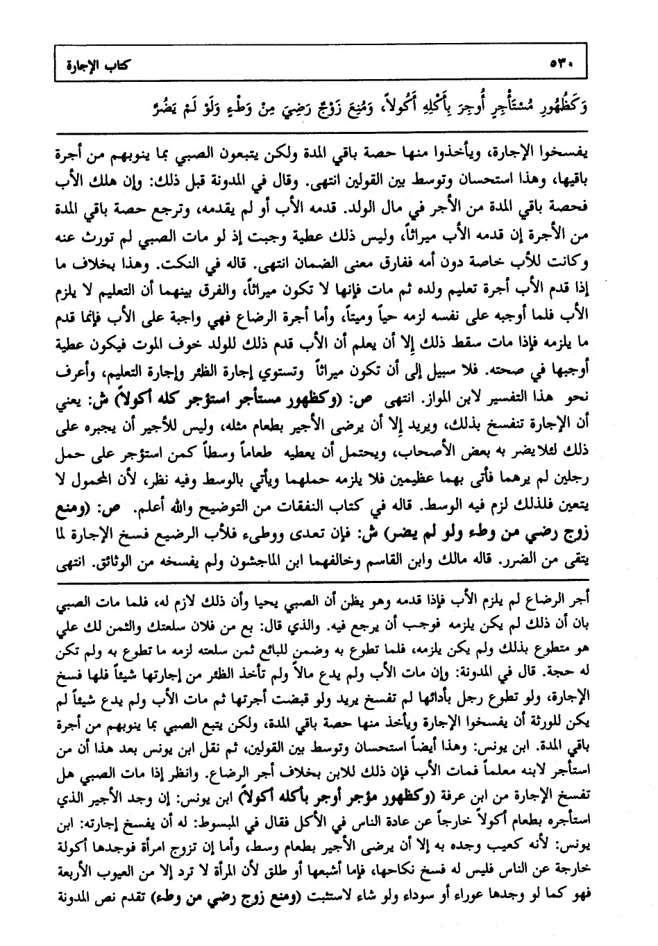 يفسخوا الإجارة ويأخذوا منها حصة باقي المدة ولكن يتبعون الصبي بما ينوبهم من أجرة باقيها، وهذا استحسان وتوسط بين القولين انتهى. وقال في المدونة قبل ذلك، وإن هلك الأب فحصة باقي المدة من الأجر في مال الولد قدمه الأب، أو لم يقدمه وترجع حصة باقي المدة من الأجرة إن قدمه الأب ميراثا، وليس ذلك عطية وجبت إذ لو مات الصبي لم تورث عنه، وكانت للأب خاصة دون أمه ففارق معنى الضمان انتهى. قاله في النكت، وهذا بخلاف ما إذا قدم الأب أجرة تعليم ولده، ثم مات فإنها لا تكون ميراثا، والفرق بينهما أن التعليم لا يلزم الأب فلما أوجبه على نفسه لزمه حيا وميتا، وأما أجرة الرضاع فهي واجبة على الأب فإنما قدم ما يلزمه، فإذا مات سقط ذلك إلا أن يعلم أن الأب قدم ذلك للولد خوف الموت، فيكون عطية أوجبها في صحته فلا سبيل إلى أن تكون ميراثا، وتستوي إجارة الظئر وإجارة التعليم، وأعرف نحو هذا التفسير لابن المواز انتهى. ص: (وكظهور مستأجر استؤجر بأكله أكولا) ش: يعني أن الإجارة تنفسخ بذلك ويريد إلا أن يرضى الأجير بطعام مثله، وليس للأجير أن يجبره على ذلك لئلا يضر به بعض الأصحاب، ويحتمل أن يعطيه طعاما وسطا كمن استؤجر على حمل رجلين لم يرهما فأتى بهما عظيمين فلا يلزمه حملهما ويأتي بالوسط، وفيه نظر؛ لأن المحمول لا يتعين فلذلك لزم فيه الوسط قاله في كتاب النفقات من التوضيح والله أعلم. ص: (ومنع زوج رضي من وطء، ولو لم يضر) ش: فإن تعدى ووطئ فلأب الرضيع فسخ الإجارة لما يتقى من الضرر قاله مالك وابن القاسم وخالفهما ابن الماجشون، ولم يفسخه من الوثائق انتهى.