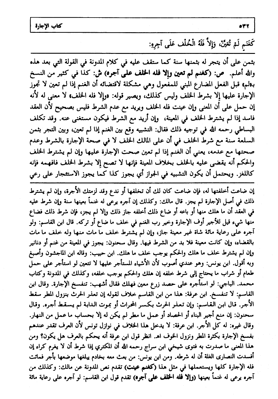 بثمن على أن يتجر له بثمنها سنة كما ستقف عليه في كلام المدونة في القولة التي بعد هذه، والله أعلم. ص: (كغنم لم تعين، وإلا فله الخلف على آجره) ش: كذا في كثير من النسخ بـ"لم" قبل الفعل المضارع المبني للمفعول، وهي مشكلة لاقتضائه أن الغنم إذا لم تعين لا تجوز الإجارة عليها إلا بشرط الخلف، وليس كذلك ويصير قوله: "وإلا فله الخلف" لا معنى له؛ لأنه إن حمل على أن المعنى، وإن عينت فله الخلف، ويريد مع عدم الشرط فليس بصحيح؛ لأن العقد فاسد إذا لم يشترط الخلف في المعينة، وإن أريد مع الشرط، فيكون مستغنى عنه، وقد تكلف البساطي - رحمه الله - في توجيه ذلك فقال: التشبيه وقع بين الغنم إذا لم تعين وبين التجر بثمن السلعة سنة مع شرط الخلف في أن على المالك الخلف لا في صحة الإجارة بالشرط وعدم صحتها مع عدمه يعني أن الغنم إذا لم تعين صحت الإجارة عليها، وإن لم يشترط الخلف والحكم أنه يقضى عليه بالخلف بخلاف المعينة فإنها لا تصح إلا بشرط الخلف فافهمه فإنه كاللغز، ويحتمل أن يكون التشبيه في الجوائح يجوز كذا كما يجوز الاستئجار على رعي