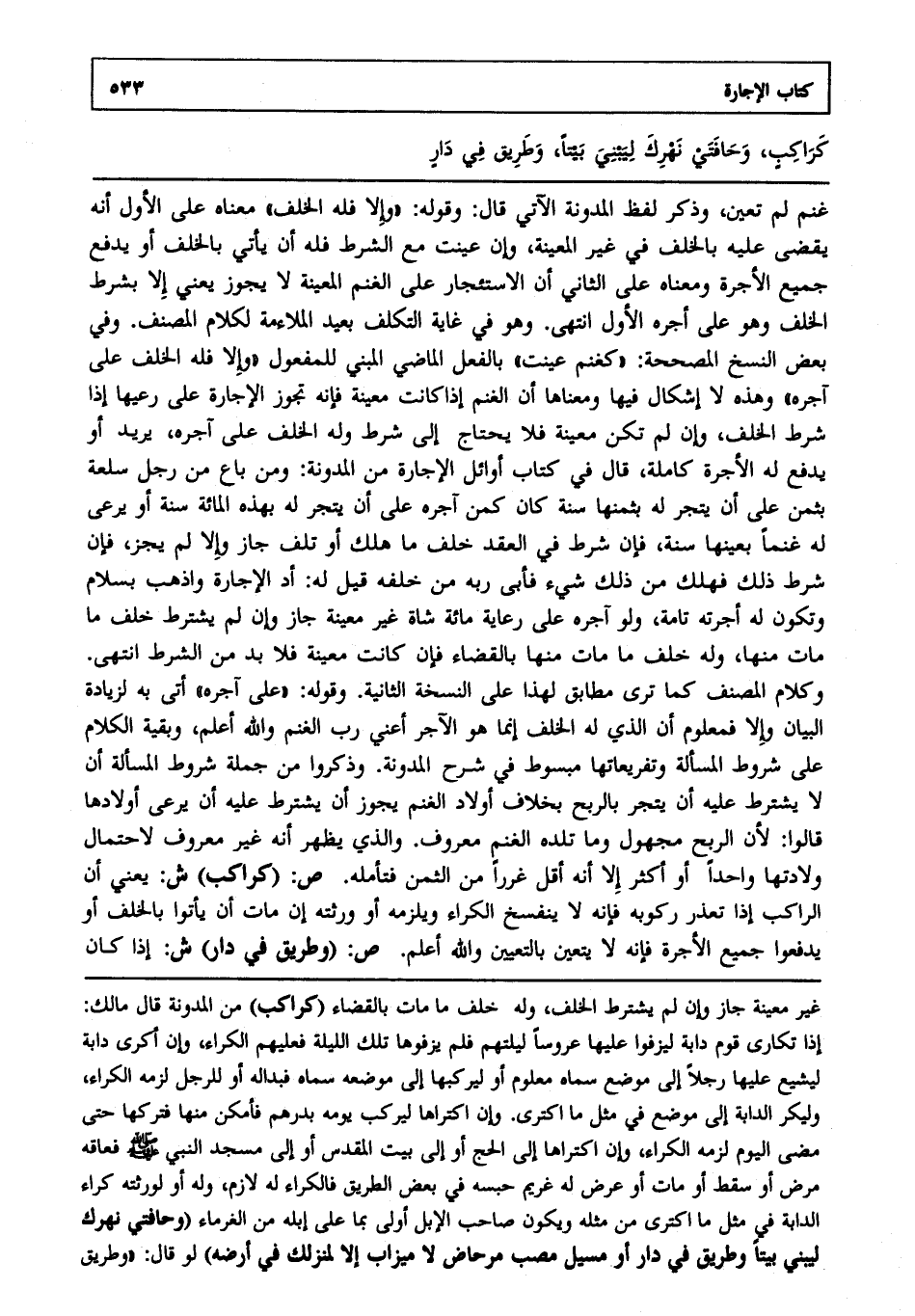 غنم لم تعين، وذكر لفظ المدونة الآتي قال: وقوله: "وإلا فله الخلف" معناه على الأول أنه يقضى عليه بالخلف في غير المعينة، وإن عينت مع الشرط فله أن يأتي بالخلف، أو يدفع جميع الأجرة ومعناه على الثاني: أن الاستئجار على الغنم المعينة لا يجوز يعني إلا بشرط الخلف، وهو على أجره الأول انتهى. وهو في غاية التكلف بعيد الملاءمة لكلام المصنف، وفي بعض النسخ المصححة: "كغنم عينت" بالفعل الماضي المبني للمفعول، "وإلا فله الخلف على آجره"، وهذه لا إشكال فيها، ومعناها: أن الغنم إذا كانت معينة فإنه تجوز الإجارة على رعيها إذا شرط الخلف، وإن لم تكن معينة فلا يحتاج إلى شرط، وله الخلف على آجره يريد، أو يدفع له الأجرة كاملة قال في كتاب أوائل الإجارة من المدونة ومن باع من رجل سلعة بثمن على أن يتجر له بثمنها سنة كان كمن آجره على أن يتجر له بهذه المائة سنة، أو يرعى له غنما بعينها سنة، فإن شرط في العقد خلف ما هلك، أو تلف جاز، وإلا لم يجز، فإن شرط ذلك فهلك من ذلك شيء فأبى ربه من خلفه قيل له: أد الإجارة واذهب بسلام، وتكون له أجرته تامة، ولو آجره على رعاية مائة شاة غير معينة جاز، وإن لم يشترط خلف ما مات منها، وله خلف ما مات منها بالقضاء، فإن كانت معينة فلا بد من الشرط انتهى. وكلام المصنف كما ترى مطابق لهذا على النسخة الثانية، وقوله: "على آجره" أتى به لزيادة البيان، وإلا فمعلوم أن الذي له الخلف إنما هو الآجر أعني رب الغنم والله أعلم. وبقية الكلام على شروط المسألة وتفريعاتها مبسوط في شرح المدونة وذكروا من جملة شروط المسألة أن لا يشترط عليه أن يتجر بالربح بخلاف أولاد الغنم يجوز أن يشترط عليه أن يرعى أولادها قالوا؛ لأن الربح مجهول، وما تلده الغنم معروف، والذي يظهر أنه غير معروف لاحتمال ولادتها واحدا، أو أكثر إلا أنه أقل غررا من الثمن فتأمله. ص: (كراكب) ش: يعني أن الراكب إذا تعذر ركوبه فإنه لا ينفسخ الكراء ويلزمه أو ورثته إن مات أن يأتوا بالخلف، أو يدفعوا جميع الأجرة فإنه لا يتعين بالتعيين، والله أعلم. ص: (وطريق في دار) ش: إذا كان