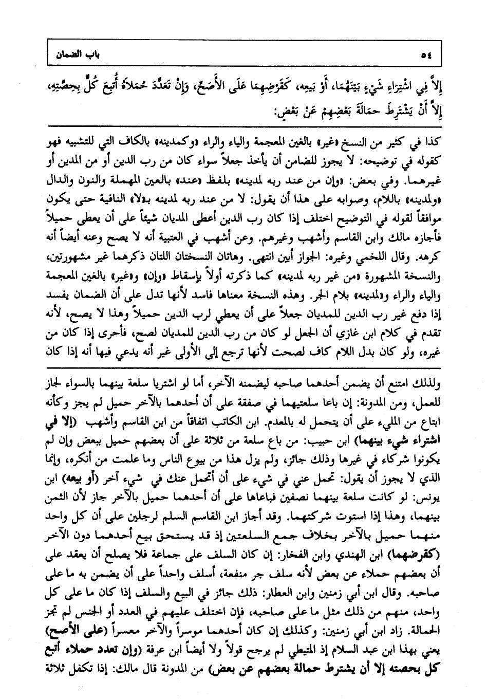 كذا في كثير من النسخ "غير" بالغين المعجمة والياء والراء "وكمدينه" بالكاف التي للتشبيه فهو كقوله في توضيحه: لا يجوز للضامن أن يأخذ جعلا سواء كان من رب الدين، أو من المدين، أو غيرهما وفي بعض: "وإن من عند ربه لمدينه" بلفظ "عند" بالعين المهملة والنون والدال "ولمدينه" باللام وصوابه على هذا أن يقول: لا من عند ربه لمدينه بـ"لا" النافية حتى يكون موافقا لقوله في التوضيح اختلف إذا كان رب الدين أعطى المديان شيئا على أن يعطي حميلا فأجازه مالك وابن القاسم وأشهب، وغيرهم وعن أشهب في العتبية أنه لا يصح وعنه أيضا أنه كرهه، وقال اللخمي: وغيره الجواز أبين انتهى. وهاتان النسختان اللتان ذكرهما غير مشهورتين والنسخة المشهورة "من غير ربه لمدينه" كما ذكرته أولا بإسقاط "وإن" و"غير" بالغين المعجمة والياء والراء "ولمدينه" فاللام الجر وهذه النسخة معناها فاسد؛ لأنها تدل على أن الضمان يفسد إذا دفع غير رب الدين للمديان جعلا على أن يعطي لرب الدين حميلا، وهذا لا يصح؛ لأنه تقدم في كلام ابن غازي أن الجعل لو كان من رب الدين للمديان لصح فأحرى إذا كان من غيره ولو كان بدل اللام كاف لصحت؛ لأنها ترجع إلى الأولى غير أنه يدعي فيها أنه إذا كان